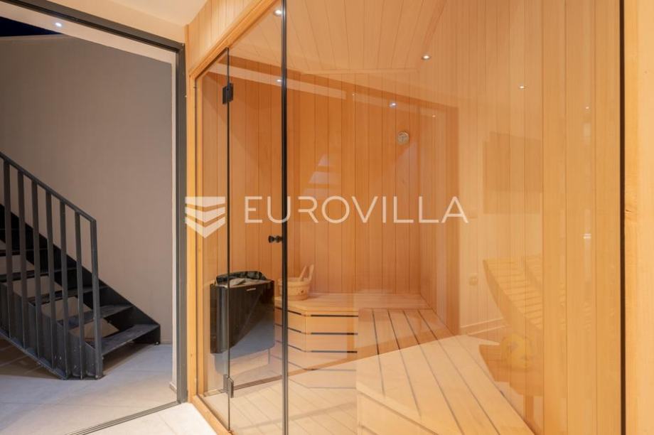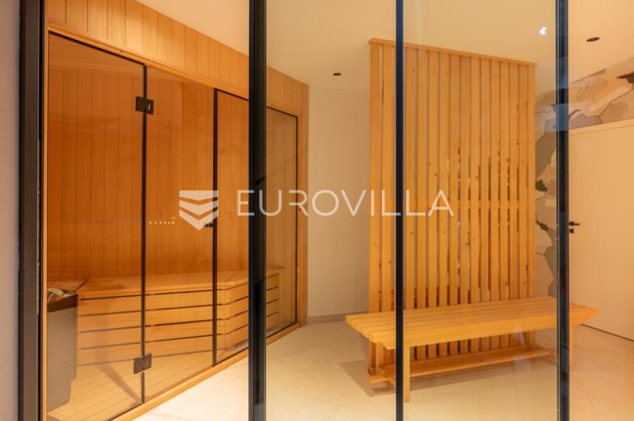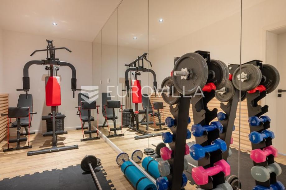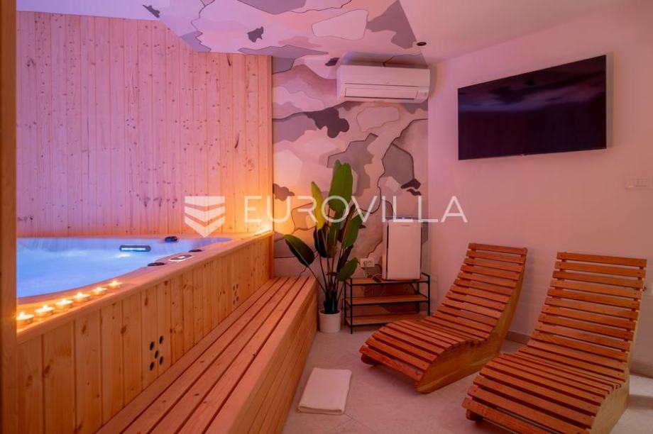 Solin, Klis, novoizgrađena villa NKP 221 m2, s parkingom za 3 vozila i vanjskim bazenom, izgrađena na zemljištu površine 470 m2 s pogledom na more i Split.Villa je visine suterena i prizemlja. U suterenu se nalaze četiri spavaće sobe, tri kupaonice, sauna s jacuzzi em, teretana, terasa, bazen...