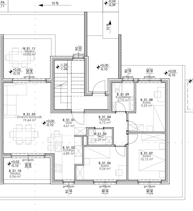Solin, Mravinci, na mirnoj lokaciji idealnoj za obiteljski život , predviđena je izgradnja manjeg stambenog objekta moderne vizure, s funkcionalnim rasporedom stambenih jedinica.Stan S2 - smješten je u prizemlju, a u naravni je trosoban stan.Sastoji se od ulaznog hodnika, kupaonice, WC-a, tri spavaće sobe i dnevnog prostora ( kuhinja s blagovaonicom i dnevni boravak ). Pripadaju mu dvije terase površine 5, 96 m2 i 10, 92 m2, te vrt ukupne površine 105 m2. Površina zatvorenog stambenog dijela iznosi 70, 36 m2, dok je ukupna 90, 49 m2.Obavezna je kupnja garažnog ili vanjskog parkirnog mjesta.Početak gradnje je predviđen u prvoj polovici 2026. godine.Za sva dodatna pitanja, stojimo vam na raspolaganju....
