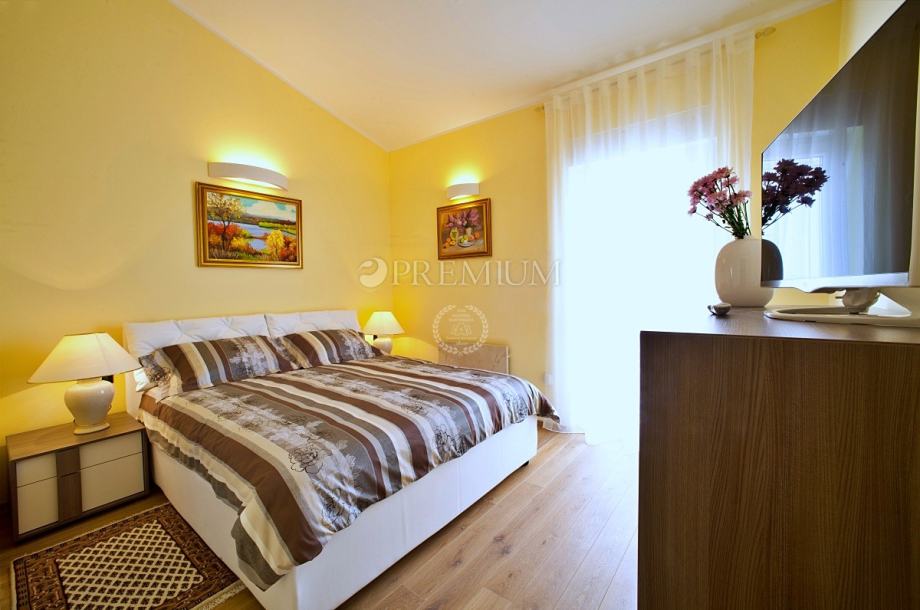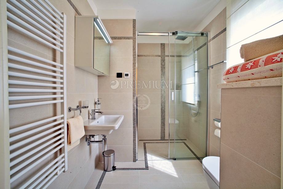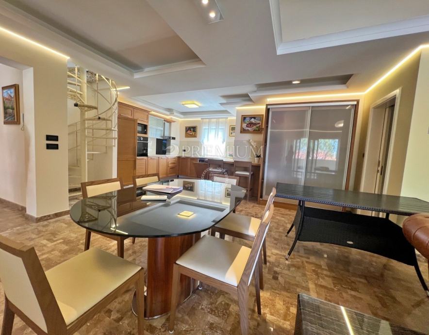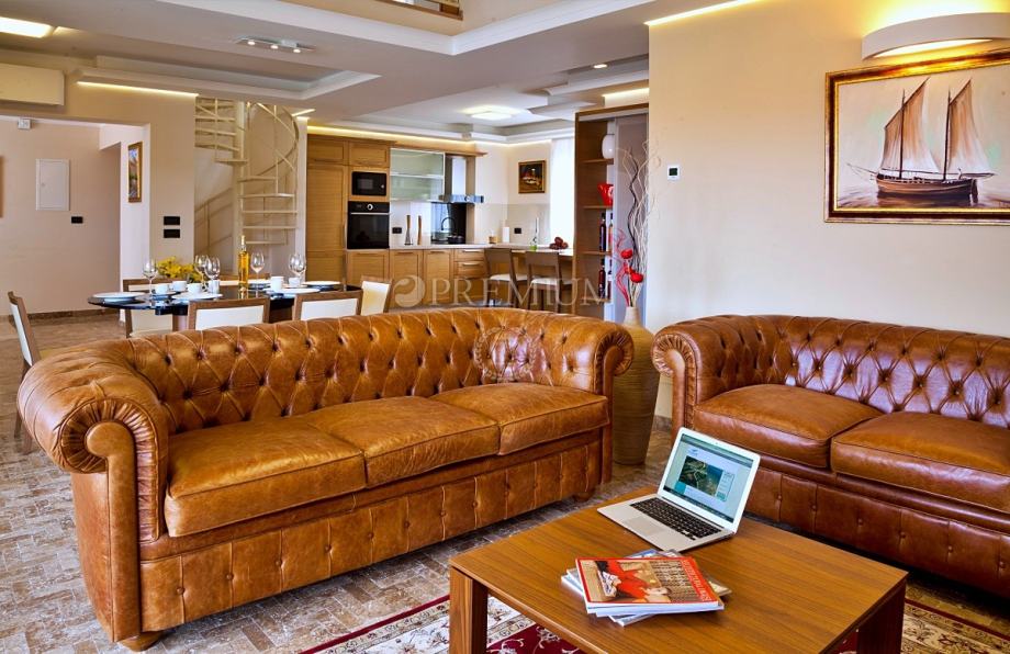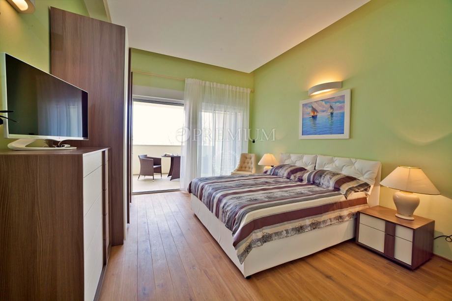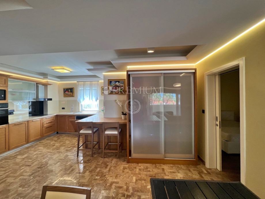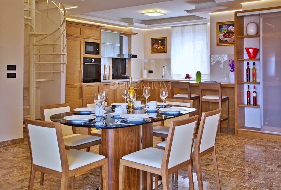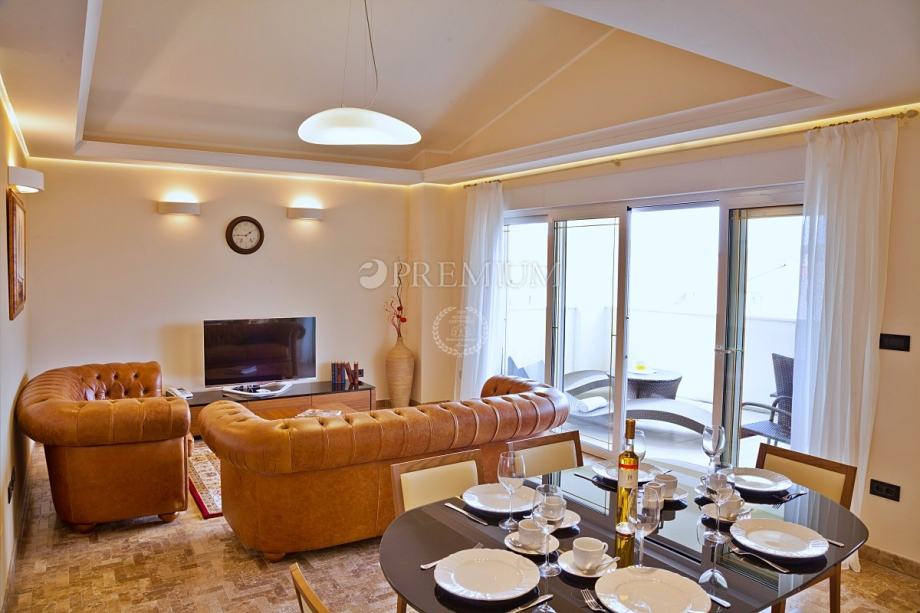 Apartman karakterizira odličan raspored prostorija, aluminijska stolarija sa zaštitnim roletama s motornim pogonom na vratima terase, klimatizacija svih prostorija, na podovima je kamen Travertin, vrhunska moderna keramika, podno grijanje s regulacijom svake prostorije posebno, sanitarije renomiranih proizvođača, alarmni sistem i sef, LCD TV s satelitskim prijemnikom, kupaonica sa perilicom rublja. U kupaonicama je Catalano sanitarija. Potpuno opremljena dizajnerska kuhinja od hrastovine rađena po mjeri, sa perilicom posuđa indukcijskim štednjakom na staklokeramici, ugradbenom mikrovalnom pećnicom i hladnjakom.