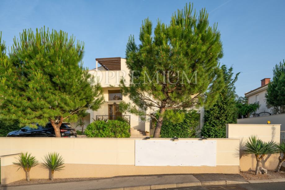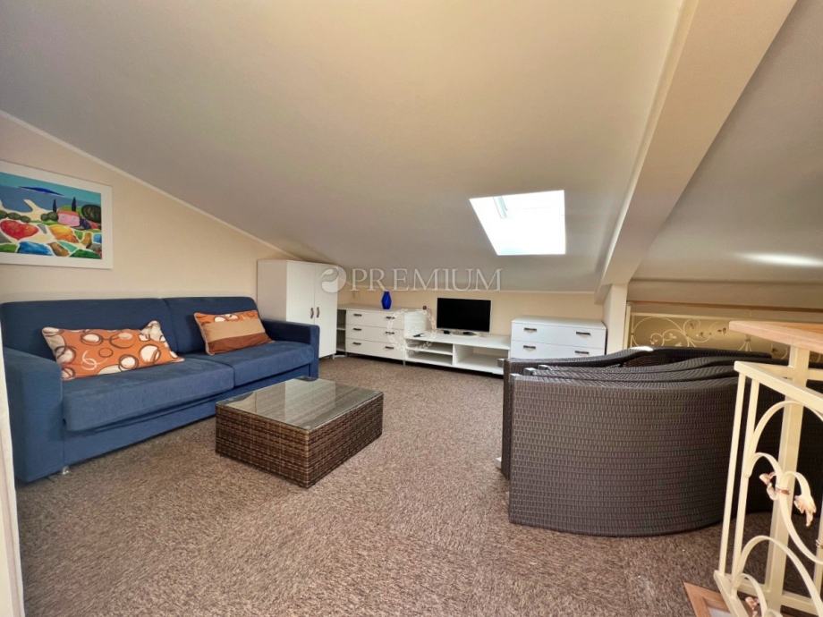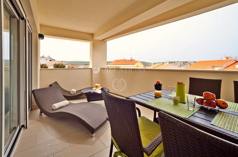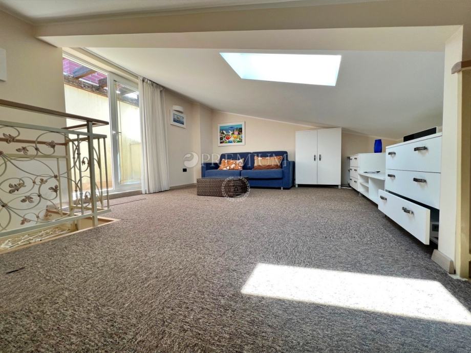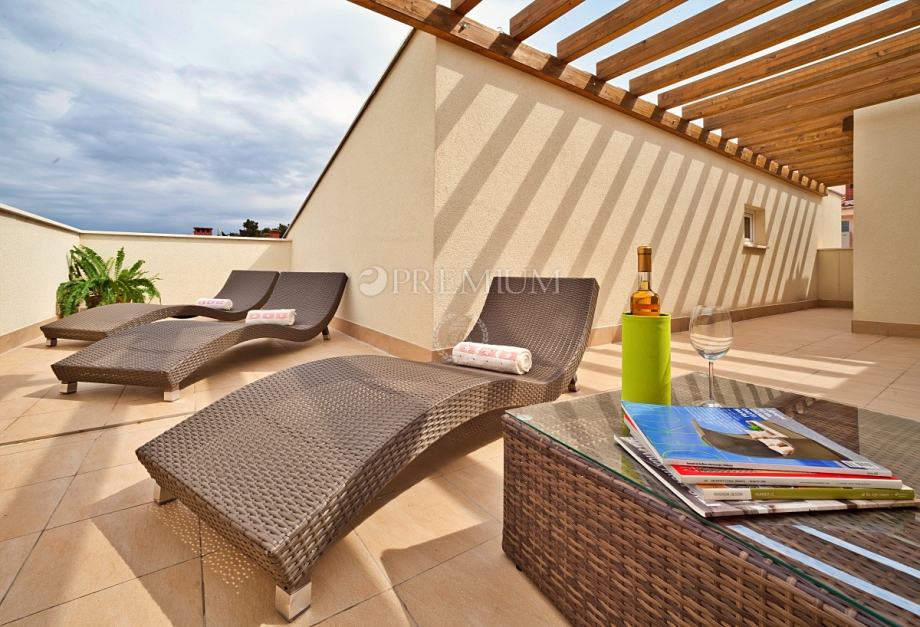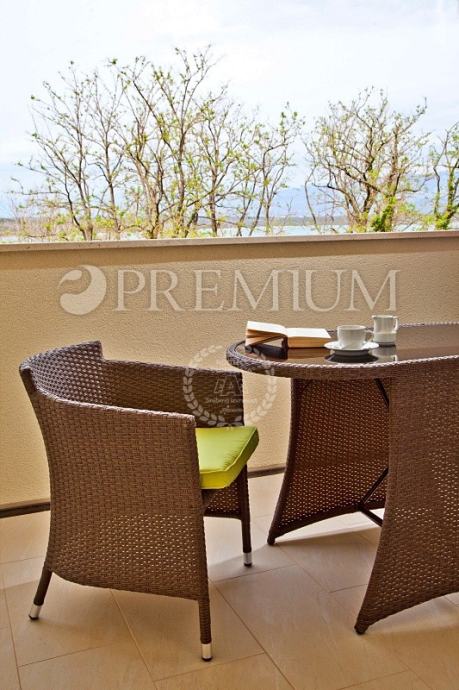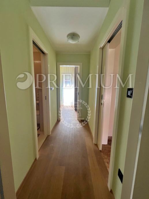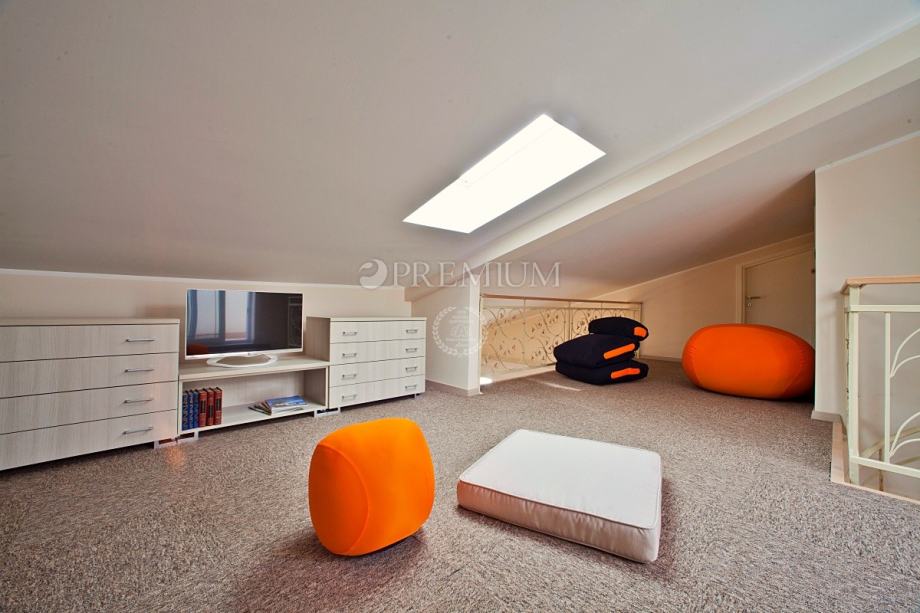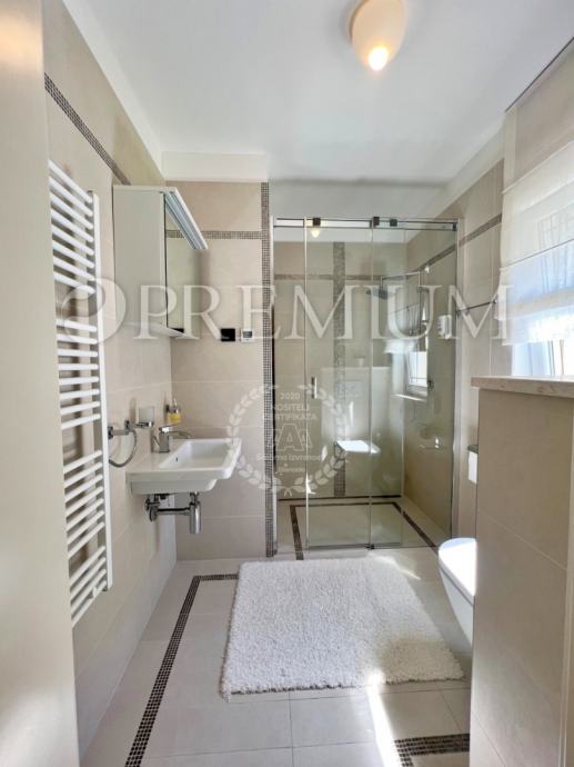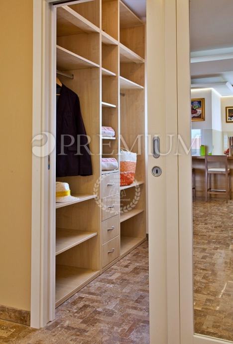Apartman karakterizira odličan raspored prostorija, aluminijska stolarija sa zaštitnim roletama s motornim pogonom na vratima terase, klimatizacija svih prostorija, na podovima je kamen Travertin, vrhunska moderna keramika, podno grijanje s regulacijom svake prostorije posebno, sanitarije renomiranih proizvođača, alarmni sistem i sef, LCD TV s satelitskim prijemnikom, kupaonica sa perilicom rublja. U kupaonicama je Catalano sanitarija. Potpuno opremljena dizajnerska kuhinja od hrastovine rađena po mjeri, sa perilicom posuđa indukcijskim štednjakom na staklokeramici, ugradbenom mikrovalnom pećnicom i hladnjakom.