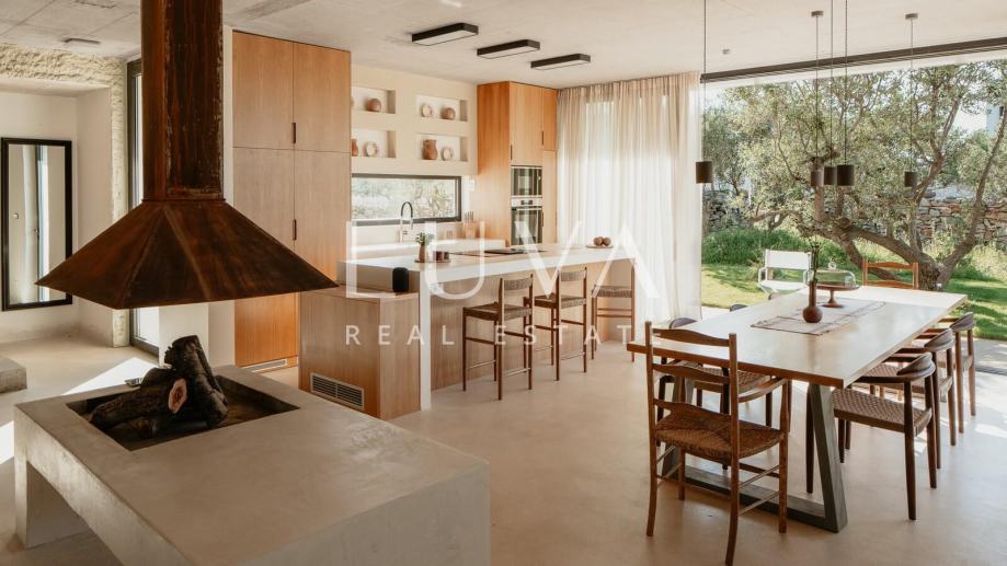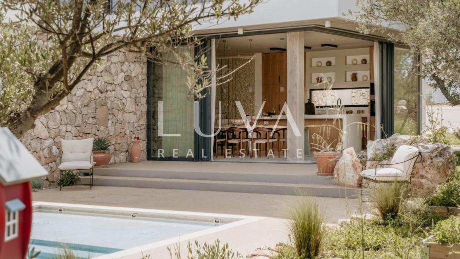 Vila je površine 270 m2, ima 4 spavaće sobe i 3 kupaonice. U prizemlju se nalaze prostrani minimalistički uređen dnevni boravak s velikim stablom masline i potpuno opremljena kuhinja iz koje se izlazi na terasu s vanjskim bazenom. Uz bazen se nalazi vanjska natkrivena kuhinja, vanjska sauna i ležaljke za sunčanje. Spavaće sobe na katu imaju izlaz na veliku terasu na kojoj se nalazi Jacuzzi iz koje se pruža predivan panoramski pogled na more. Na posjedu vile ima dovoljno parking mjesta, a sa stražnje strane vile se nalazi i garaža za 2 vozila.