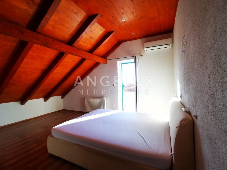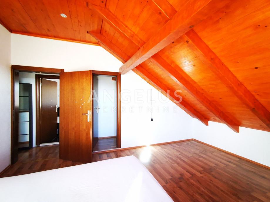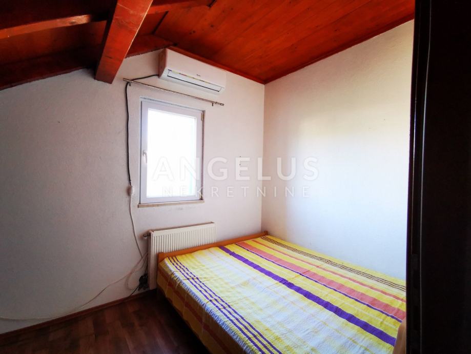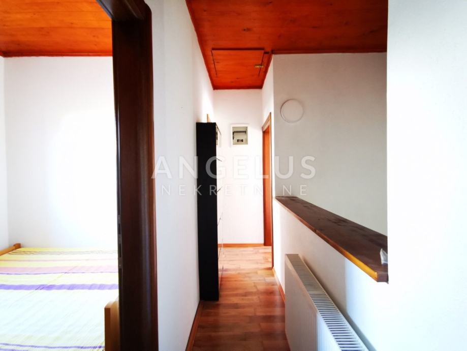 Unutarnjim stubištem dolazi se u potkrovlje gdje su smještene tri spavaće sobe, kupaonica i veliki balkon koji se proteže cijelom dužinom kuće, sa kojeg se pruža otvoren pogled na more i otočiće.