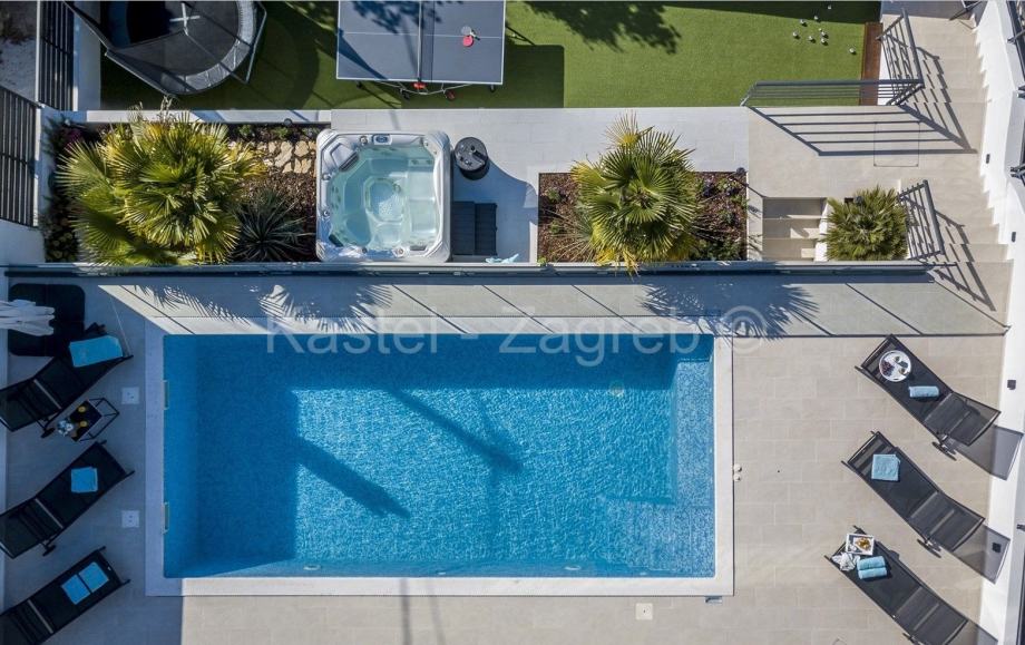 Vanjski prostor nudi privatni grijani bazen od 30 m² (8 m x 3,7 m) s hidromasažnim sustavom, jacuzzi i sunčalište. Tu je i potpuno opremljena ljetna kuhinja sa stolom za blagovanje i prostorom za odmor, oboje natkriveno ispred bazena. Nekoliko stepenica dolje vodi vas do igrališta s trampolinom i stolnim tenisom.