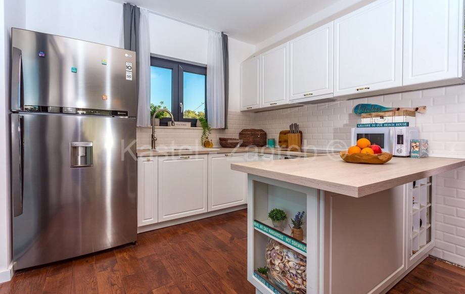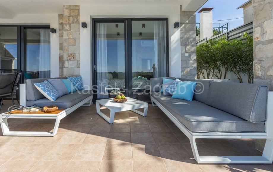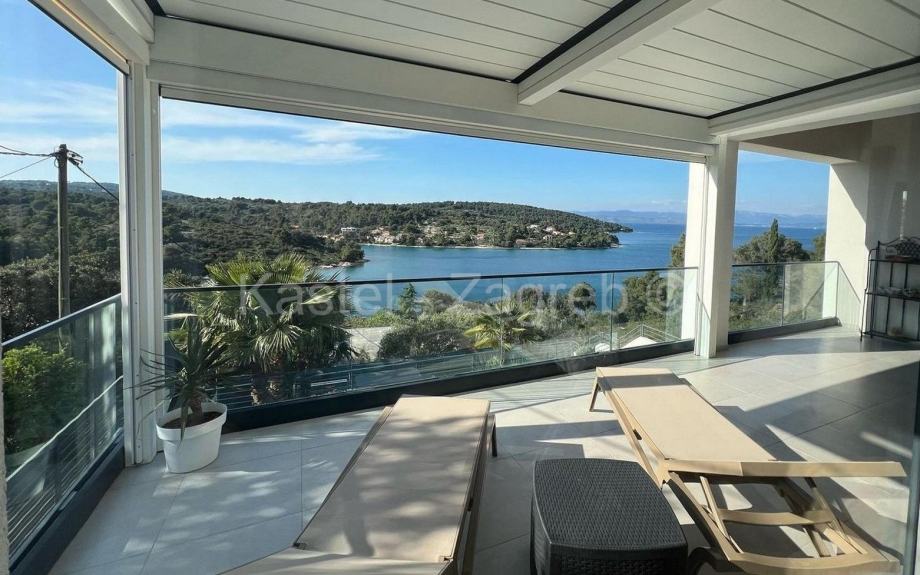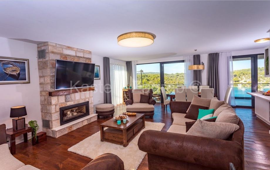 Unutarnje stubište vodi na prvi kat sa otvorenim dnevnim boravkom sa kaminom i potpuno opremljenom kuhinjom s blagovaonicom te ogromnom terasom s otvorenim pogledom na more. S ove razine pristupate parkiralištu i glavnom ulazu u vilu. Privatno parkiralište osigurano je ispred kuće za 2 automobila.