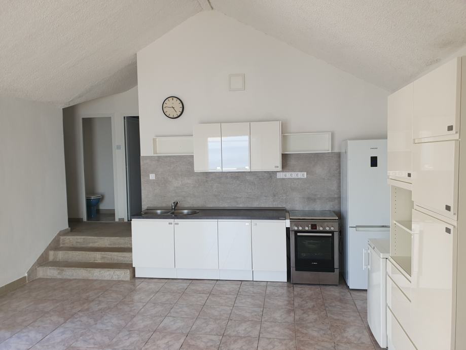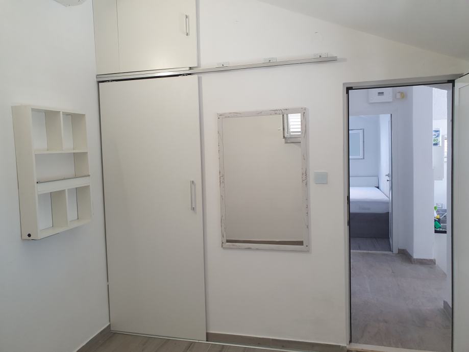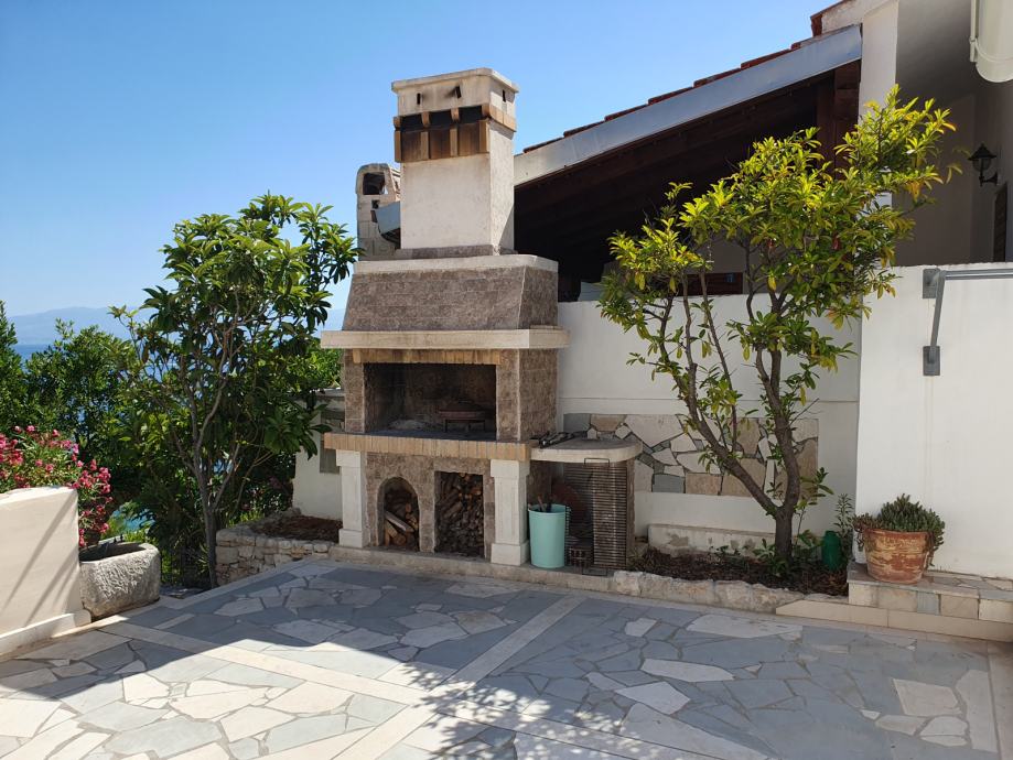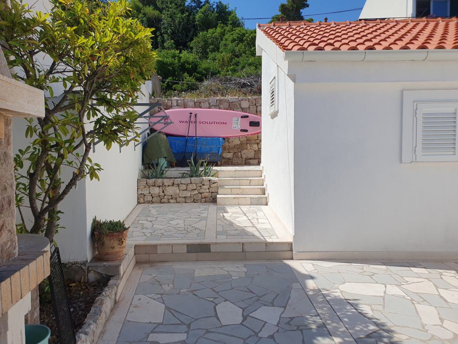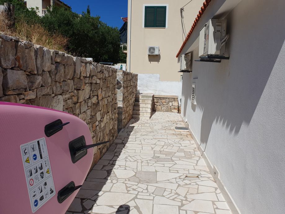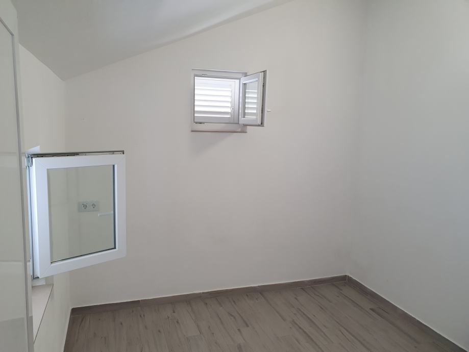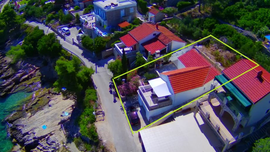 The house is 100m2 with two bedrooms. Each room has its own AC unit, common corridor with bathroom with toilet + separate toilet. The kitchen combined with the living room has access to the terrace and balcony. The 21m2 balcony has a view of the sea and Split. The entrance terrace is 36m2 with a barbecue/grill and continues to the back of the plot, where there is an outdoor shower. Behind the house there is a part of the field of 85m2 ready for landscaping as desired. Garage and storage area is 31m2.