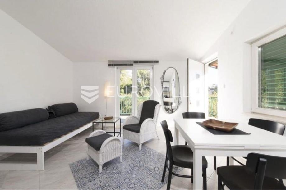 Stanu na prvom katu pripada balkon a ispred stana u prizemlju je djelomično natkrivena terasa s drvenom vrtnom garniturom i ležaljkama.