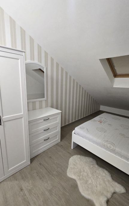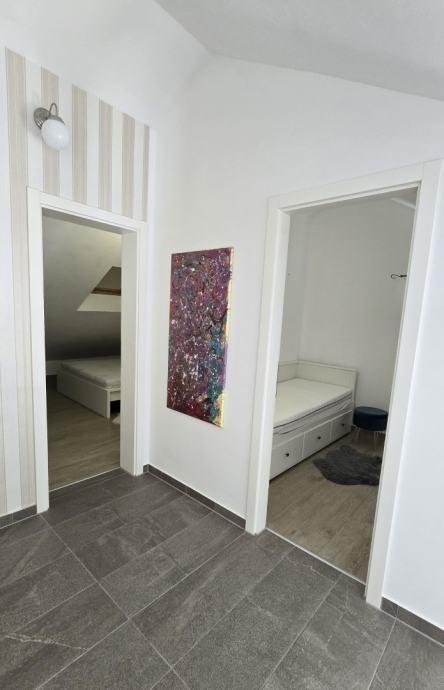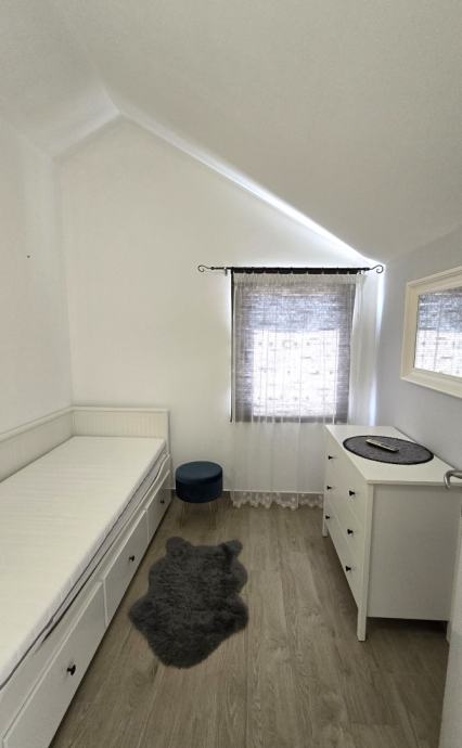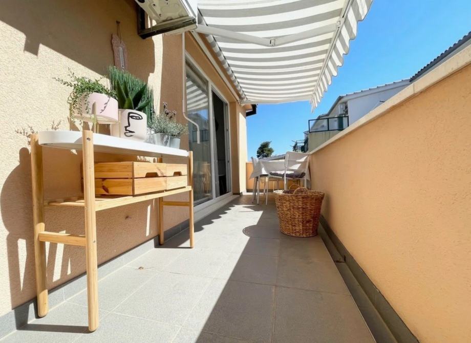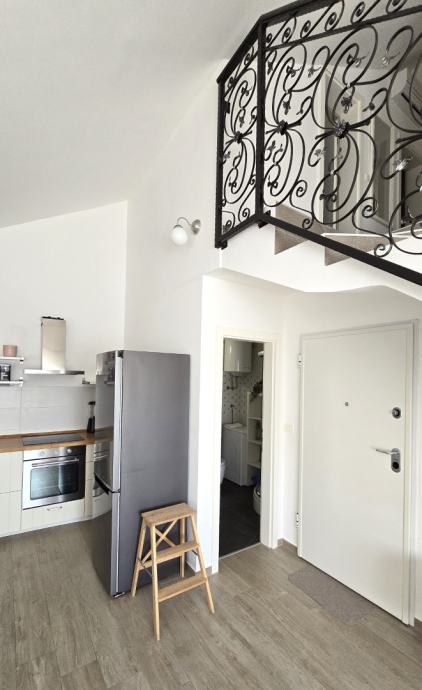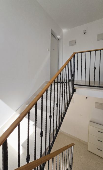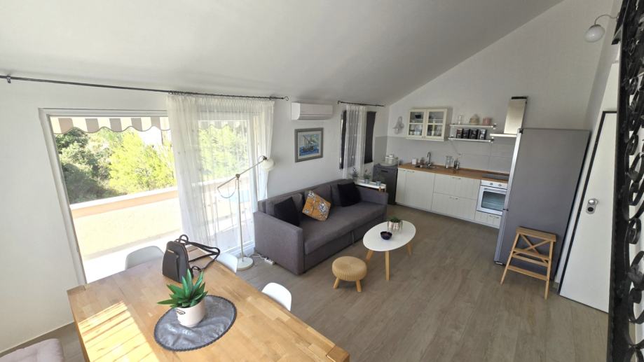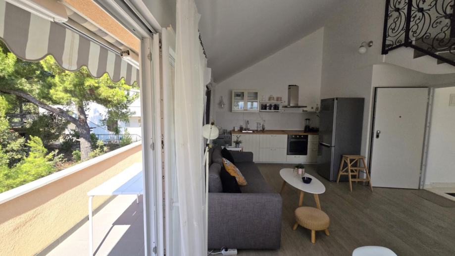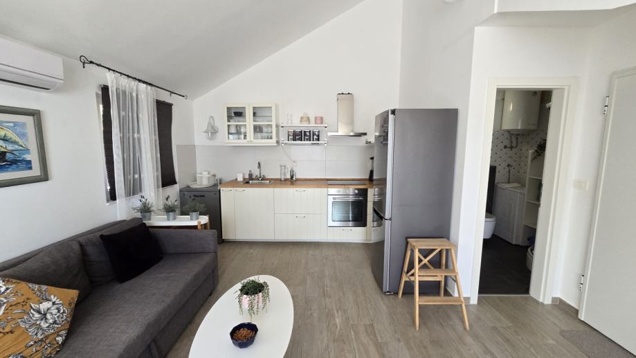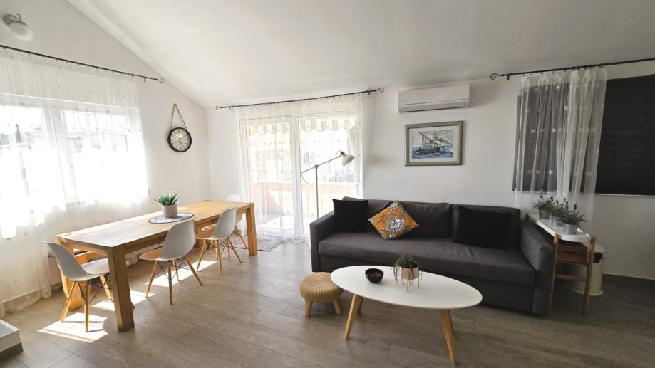 Dvoetažni trosobni komforni stan unutrašnje površine 69,12 m2, s balkonom površine 8,84 m2 i natkrivenim parking mjestom, koji se sastoji od dnevnog boravka, kuhinje s blagovaonicom, tri spavaće sobe, dvije kupaonice i balkona, prekrasan pogled na more, blizina mora i šljunčane plaže, potpuno namješten i opremljen (sve uključeno u cijenu).