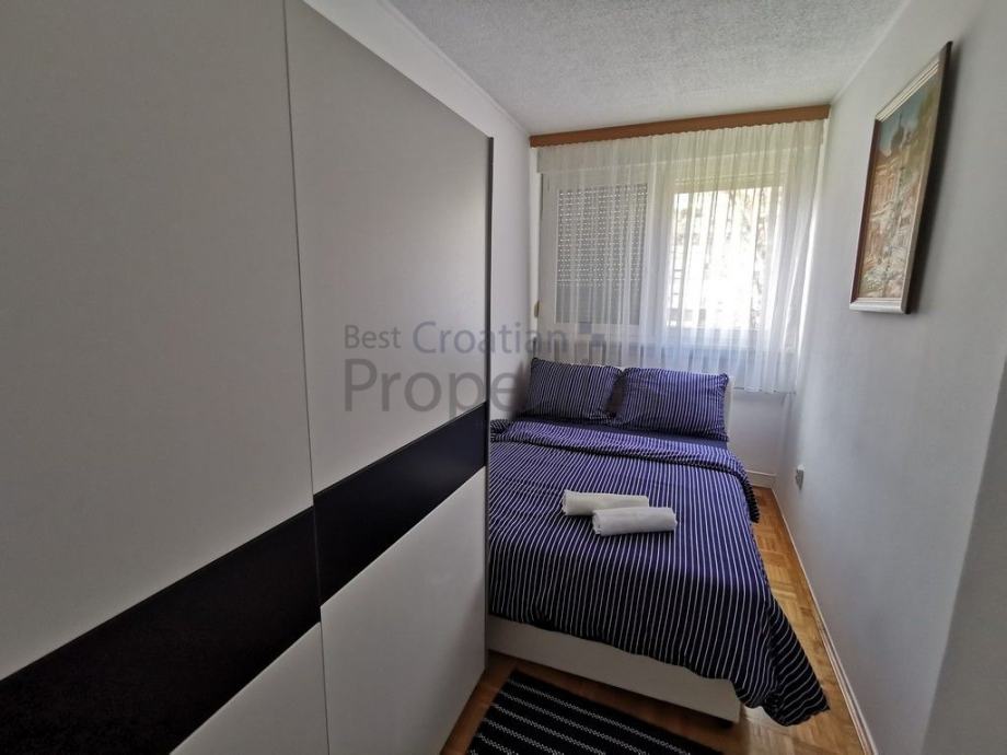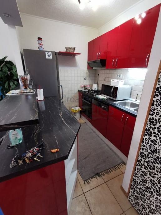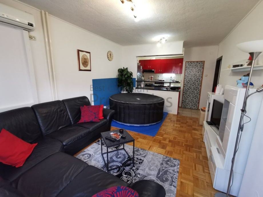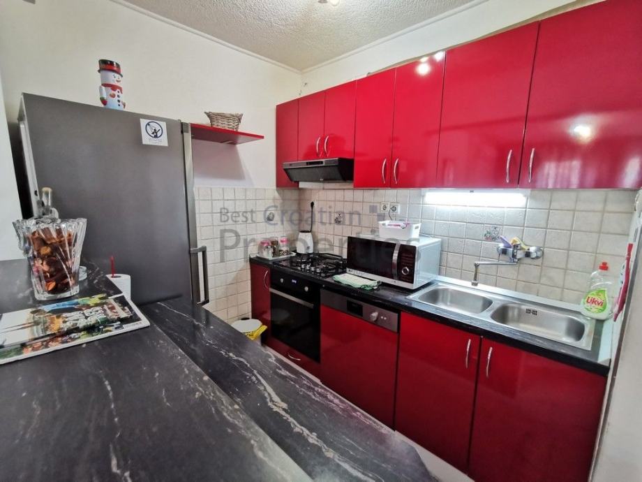 Kuhinja je pregrađena šankom, opremljena perilicom posuđa, pećnicom, frižiderom, mikrovalnom. Stan ima klima uređaj, tv, protuprovalna vrata.