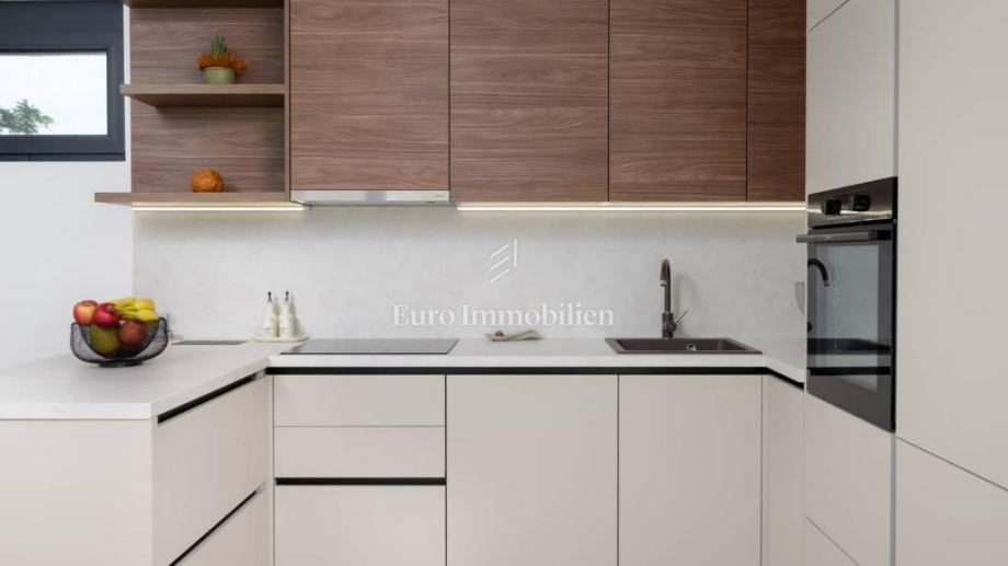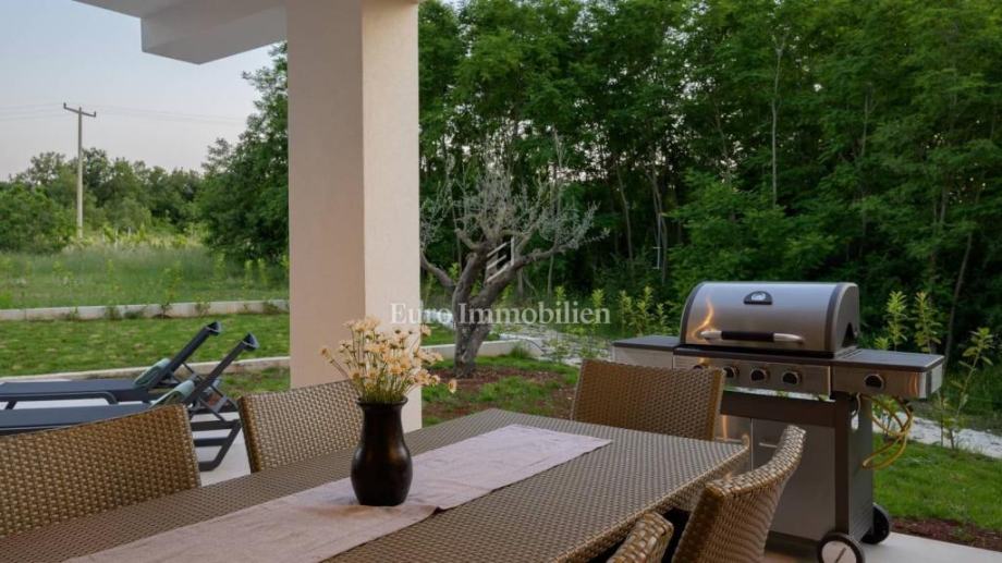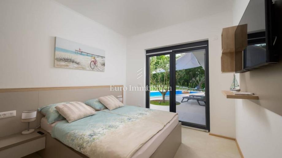 Vila se pruža na 140m2 unutarnjeg prostora te se sastoji od hodnika,tri spavaće sobe, dva kupatila, open space kuhinje sa blagovaonicom te dnevnim boravkom. Iz dnevnog boravka se izlazi na veliku terasu opremljenu roštiljem i ljetnom blagovaonom te na bazen veličine 31m2.