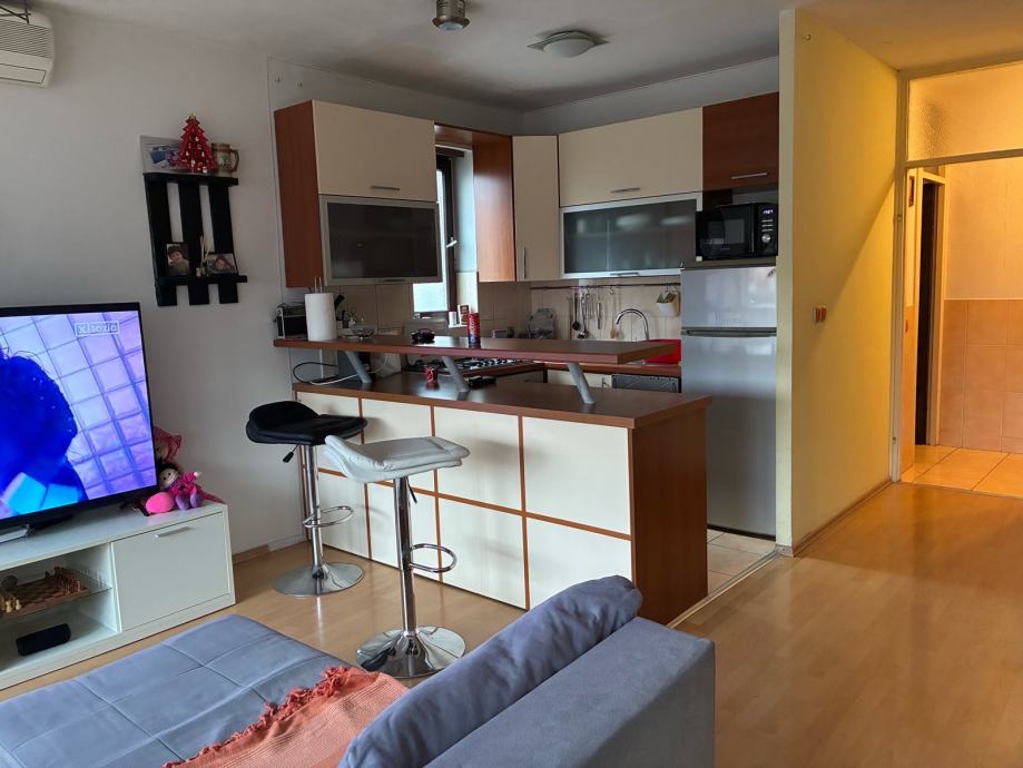 Stan se sastoji od ulaznog hodnika, kupaone s WC-om, dnevnog boravka s kuhinjom i rostorom za blagovanje i male spavaće sobe.