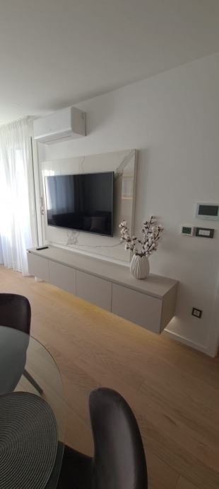 Ovaj elegantan dvosoban stan površine 43,88 m² potpuno je namješten i opremljen modernim namještajem i vrhunskim uređajima te se prodaje kao takav.