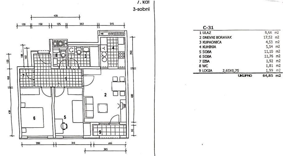 Ovaj atraktivni trosoban stan smješten je na 7. katu stambene zgrade izgrađene 2008. godine, s liftom. Stan ima ukupnu površinu od 66,61 m² i nudi funkcionalan raspored prostora, idealan za obiteljski život.