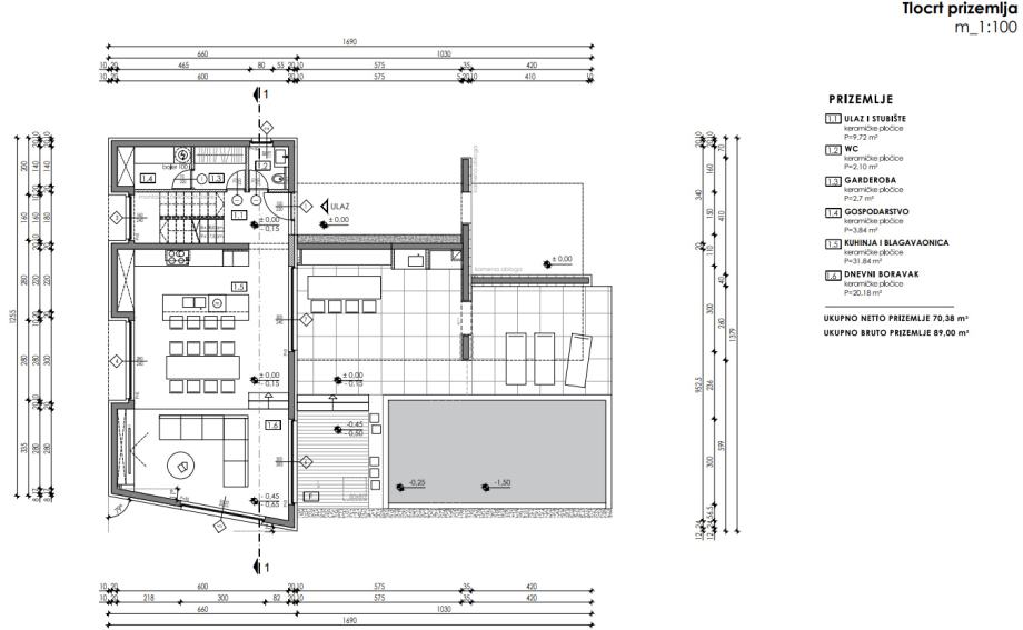 Reprezentativni ulaz vodi u otvoreni dnevni prostor koji spaja kuhinju, blagovaonicu i dnevni boravak – savršen za druženja ili opuštanje s pogledom na bazen. Prostrana terasa s bazenom, sunčalištem i natkrivenom ljetnom kuhinjom idealna je za uživanje na otvorenom. Prizemlje također uključuje garderobu, ostavu i gostinjski toalet, čime se dodatno osigurava praktičnost.