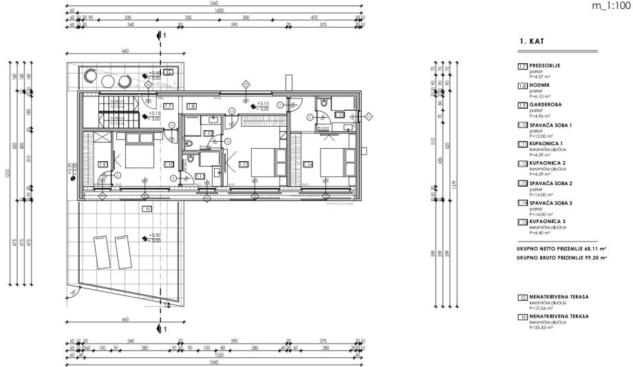Unutarnje stubište vodi na kat s tri spavaće sobe, od kojih svaka ima vlastitu kupaonicu. Glavna spavaća soba impresionira walk-in ormarom i privatnom terasom s panoramskim pogledom – pravi kutak za opuštanje.