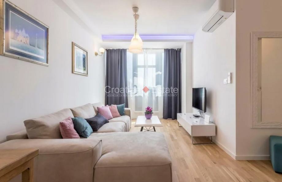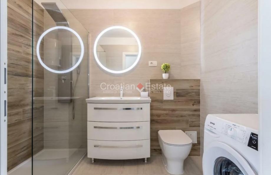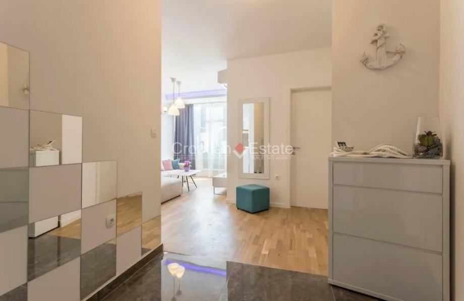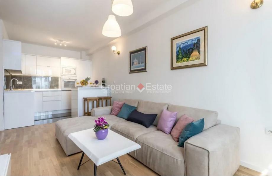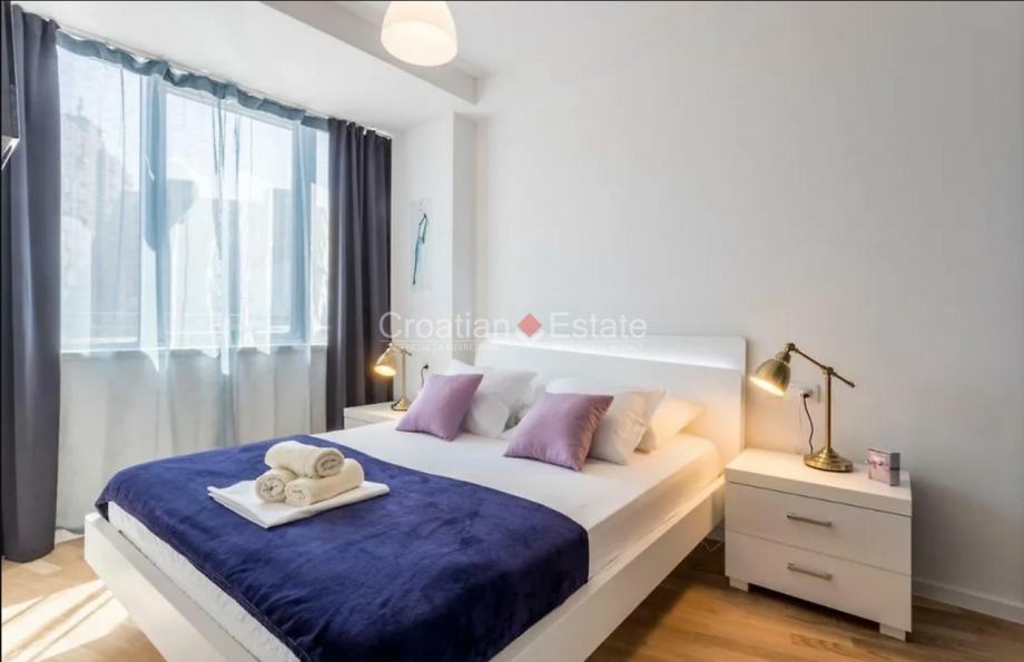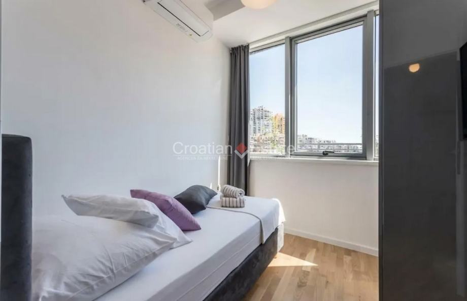 Iznajmljujemo moderan dvosoban penthouse, prepun svjetla smještena na petom katu zgrade s liftom. Sastoji se od kuhinje s blagovaonicom i dnevnim boravkom, dvije spavaće sobe, kupatila i velike terase površine 50 m2.
