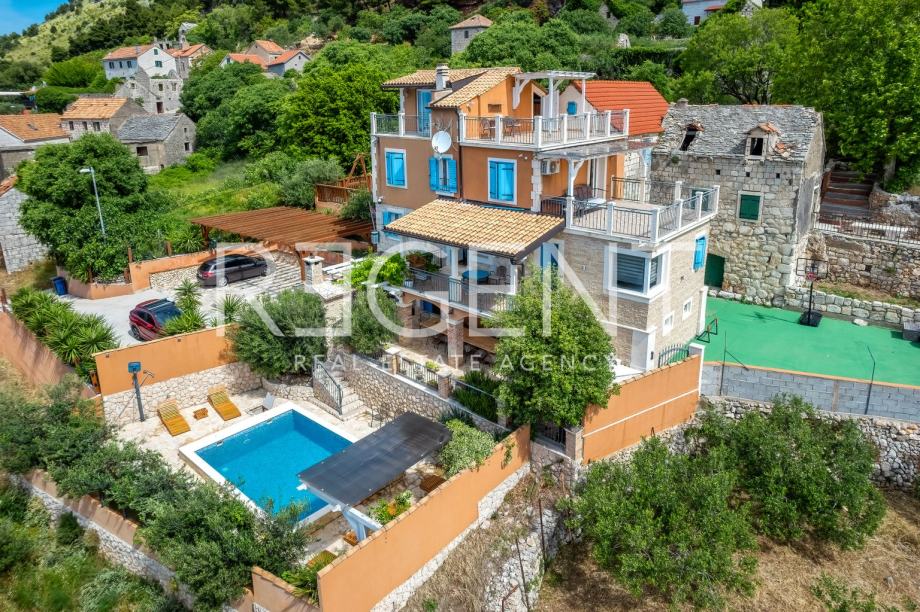 U mirnom mjestu Krilo Jesenice, samo 15 km od Splita, smjestila se ova autentična vila okružena maslinicima i netaknutom prirodom, s veličanstvenim pogledom na more. Savršena za one koji traže tišinu, mediteranski ambijent i prostranost, ova vila nudi izvrsnu priliku za obiteljski život, luksuzni odmor ili turističko ulaganje.Vila se proteže na četiri etaže i obuhvaća 10 spavaćih soba i 6 kupaonica, što pruža obilje prostora i komfora. U prizemlju se nalazi veliki dnevni boravak, muški i ženski toalet te potpuno opremljena kuhinja – idealna za okupljanja i zajedničke trenutke.Unutar istog kompleksa uređen je dodatni, odvojeni objekt s vlastitim dnevnim boravkom, kuhinjom, ležajem za dvije osobe i toaletom, što ga čini idealnim kao smještaj za goste ili osoblje.Vanjski dio vile oduševljava: bazen okružen zelenilom, dječje igralište i prostrani parking jamče uživanje na otvorenom i maksimalnu funkcionalnost. Cijela nekretnina je uređena u autentičnom dalmatinskom stilu s puno kamena i prirodnih detalja, pružajući osjećaj topline i povezanosti s okolišem.Ova vila predstavlja spoj privatnosti, prirode i blizine grada – rijetkost na tržištu. Za sve dodatne informacije i razgled, stojimo Vam na raspolaganju.Za više informacija, kontaktirajte našeg agenta na brojeve telefona: