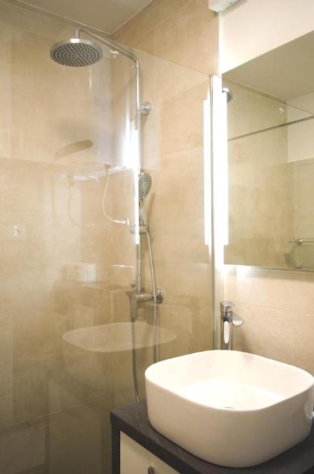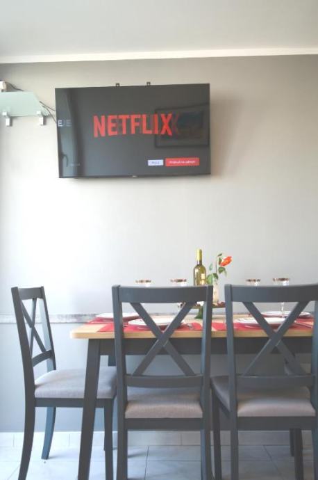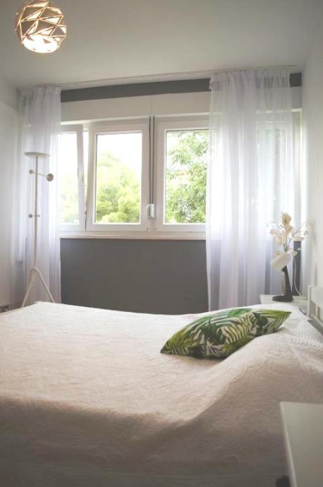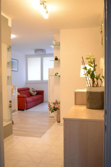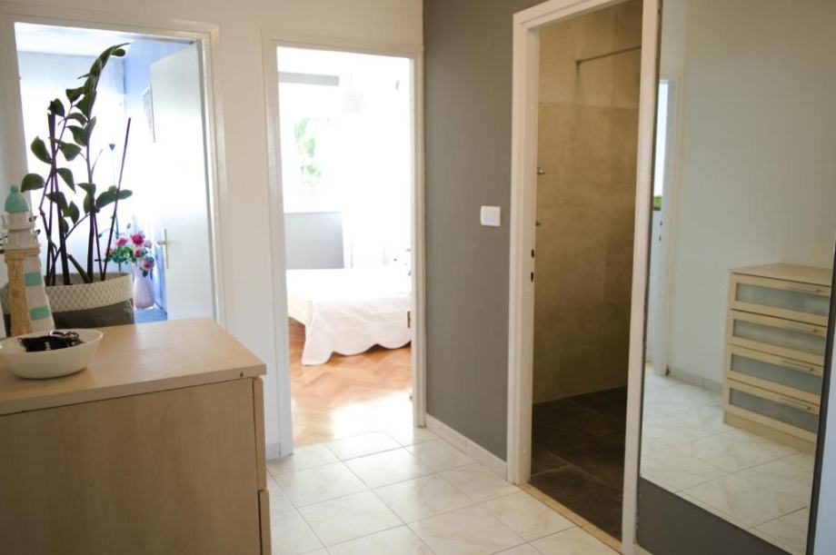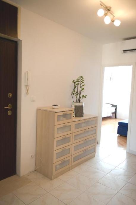 Položen je na trećem katu zgrade bez lifta, sastoji se od kuhinje s blagovaonicom i dnevnim boravkom, hodnika, dvije sobe, kupaonice i balkona. U potpunosti je opremljen svim potrebnim uređajima i namješten.
