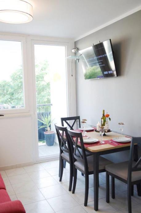 It is located on the third floor of a building without an elevator, it consists of a kitchen with a dining room and a living room, a hallway, two bedrooms, a bathroom and a balcony. It is fully equipped with all necessary appliances and furnished.