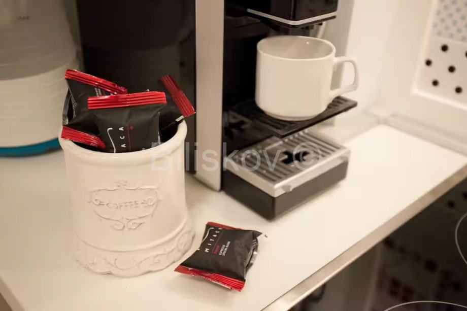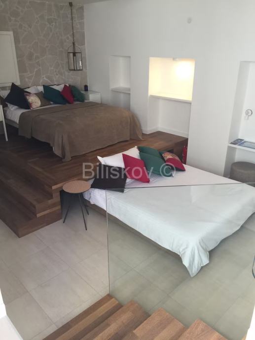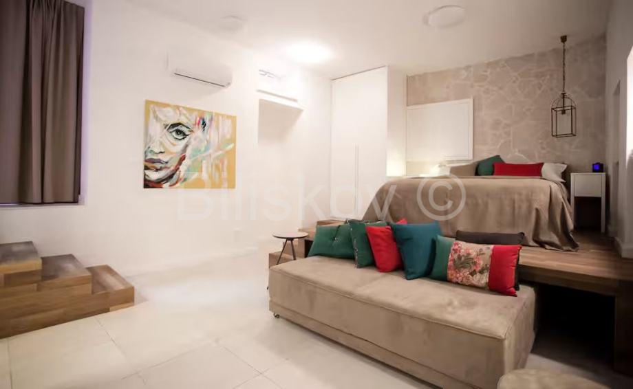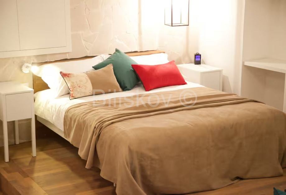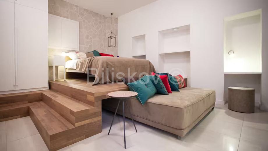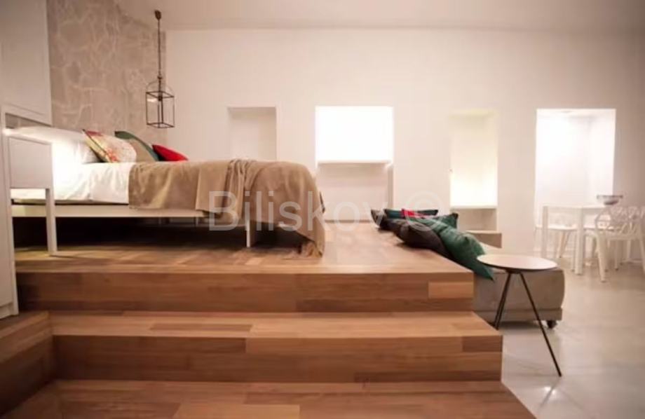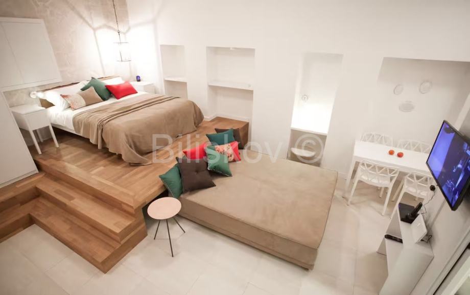 Apartman je izuzetno smišljeno namješten i opremljen i prostor je maksimalno iskorišten. Posebnost je krevet koji se nalazi povišen par stepenica i ispod njega je uvučen drugi, koji se preko dana koristi kao kauč, a po potrebi se izvlači i postaje dodatni krevet za dvije osobe. Prostor ispod stepenica je iskorišten kao manje spremište i u njemu je skrivena perilica rublja.