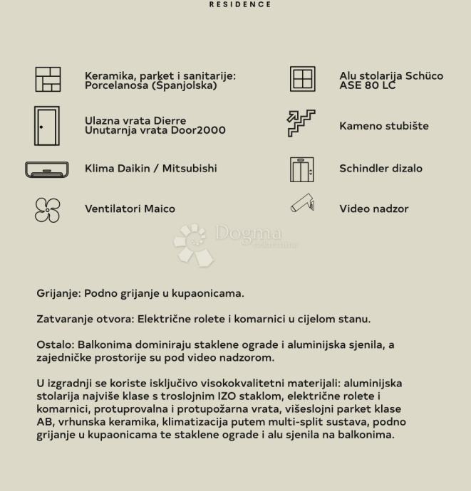 Svi stanovi su klimatizirani (multi-split sustav), a kupaonice imaju podno grijanje, kanalice i podžbukne baterije. Balkoni imaju staklene ograde i alu sjenila, a zajednički prostori su pod video nadzorom.