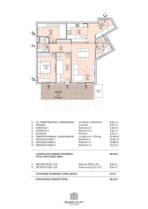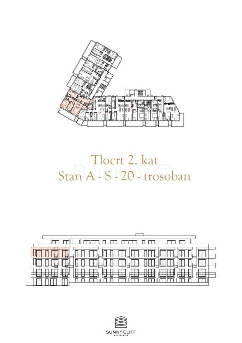 Stan A-S-20 – Trosoban stan površine 98,53m2 nalazi se na 2.katu, J-Z. Stan se sastoji se od tri spavaće sobe, kuhinje, dnevnog boravka s blagovaonicom, dvije kupaonice, hodnika i ulaznog predprostora s garderobom – ukupne površine 88.76 m2, sa balkonom od 18,63 m2 (obračunski 9,32 m2) što sveukupno daje 98,53 m2.