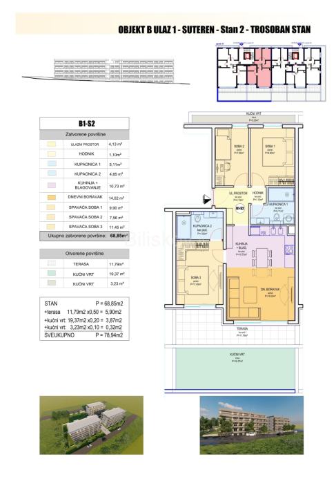 Split, Duilovo, prodaja, stanovi, novogradnja, 3 zgradePosredujemo u prodaji stanova u 3 zgrade koje predstavljaju jedan kompleks. Osigurajte novogradnju po povoljnijoj cijeni od većine starih zgrada!!Početak radova do ljeta 2026., a rok za izgradnju je 30 mjeseci od početka radova.Dinamika plaćanja:30% prilikom potpisivanja predugovora40% po završetku betonske konstrukcije30% po završetku fasadeSve 3 zgrade povezane su liftom iz dvije podrumske etaže s parkirnim mjestima i spremištima.Cijena parkirnih mjesta u zatvorenom podrumu iznosi 2.000 €/m2, vanjskih parkirnih mjesta 1.800 €/m2, a spremišta 2.200 €/m2.Zgrada B ima 2 ulaza s liftom, sastoji se od podruma, prizemlja i 3 kata, te nudi sljedeće stanove:B1-S1 3-sobni jugozapad-sjever 97,98m2, 4.650€/m2 455.607€B1-S2 3-sobni jug-sjever 78,94m2, 4.800€/m2 378.912€B1-S3 3-sobni jugozapad-sjever 100,94m2 4.850€/m2 489.559€B1-S4 3-sobni jug-sjever 74,81m2, 4.950€/m2 370.309,50€