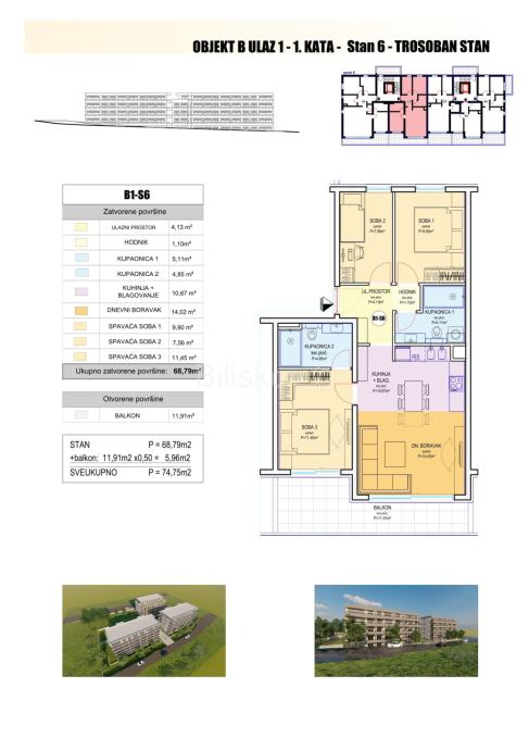 B1-S6 3-sobni jugozapad-sjever 74,75m2, 5.100€/m2 381.225€