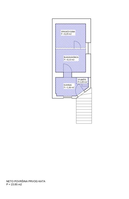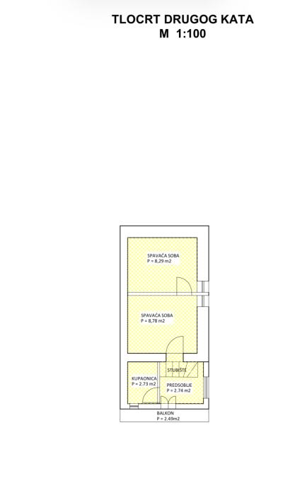 Na prvoj etaži na koju se dolazi zasebnim vanjskim stepeništem nalazi se kuhinja i dvije prostorije -blagovaonica i spavaća soba. Na drugoj etaži je kupaonica, predsoblje, balkon od 2.5m2 i dvije spavaće sobe. Ispred stana je zajedničko dvorište i spremište od 5m2 koje pripada stanu. Nije etazirano.