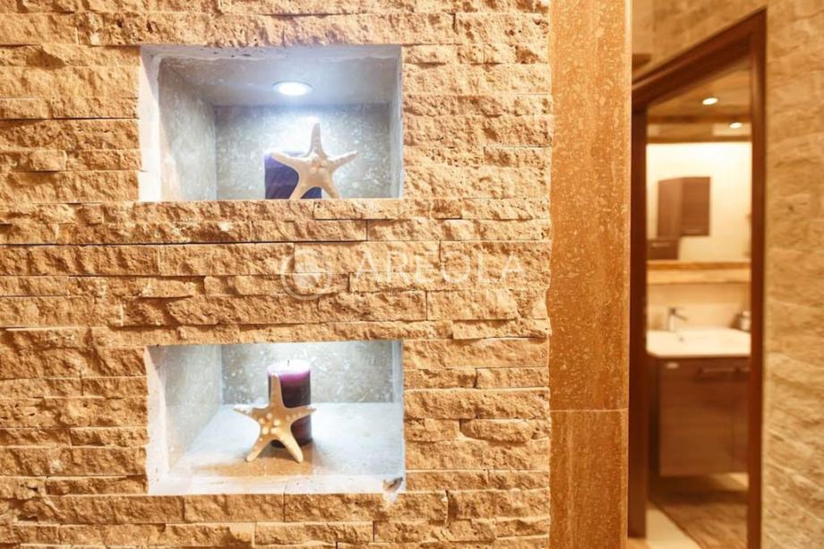 Raspored uključuje kuhinju s blagovaonicom i dnevnim boravkom s izlazom na veći balkon s pogledom na grad i more, te dvije spavaće sobe - svaka s izlazom na zaseban balkon i kupaonicom. Jedna kupaonica opremljena je kadom, a druga tušem.