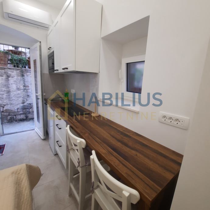 NOVO! Posredujemo u najmu male slatke garsonjere od 12m2 u prizemlju manje stambene zgrade na super lokaciji. Nalazi se odmah u blizini glavne zelene tržnice (Pazar) i Zvonimirove ulice. Ima kuhinju i spavaći prostor, kupatilo s prozorom. Upravo završena kompletna renovacija, opremljena novim vrlo kvalitetnim namještajem, aparatima i posuđem. Ima klimu, internet, TV i podno grijanje. U mirnoj i tihoj ulici. Svi sadržaji na dohvat ruke, do rive minut-dva hoda.