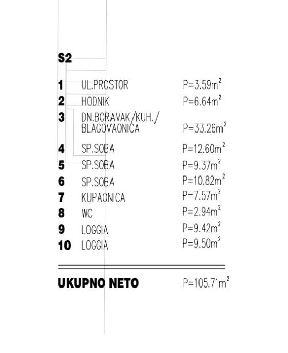 Novi trosobni komforni stan površine 105,71 m2, smješten na 1. katu manje zgrade na lokaciji Gripe, koji se sastoji od kuhinje s blagovaonicom i dnevnim prostorom (33 m2), ulaznog prostora, hodnika, tri spavaće sobe, kupaonice, WC-a i dvije velike lođe, orijentacije sjever-istok-jug, svijetao, odmah useljiv, mogućnost kupnje parking mjesta.