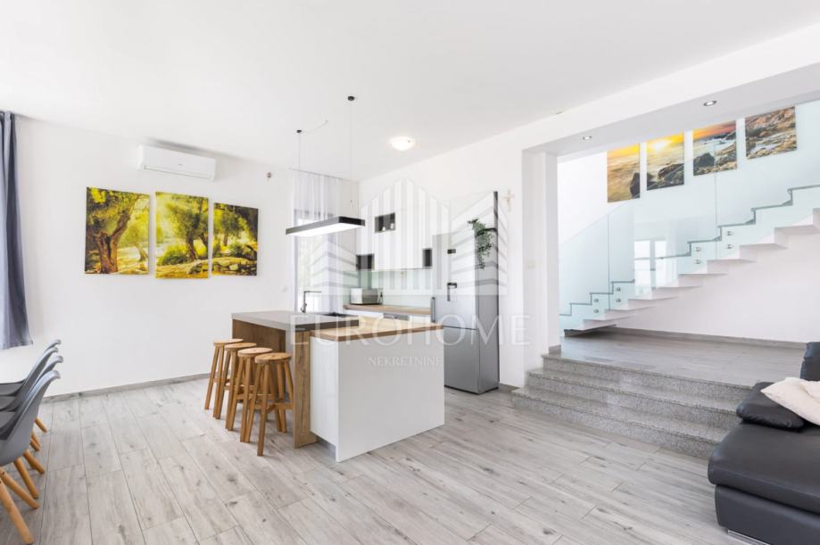 U prizemlju se nalazi prostrani dnevni boravak s blagovaonicom, moderno opremljena kuhinja te direktan izlaz na terasu i vrt s bazenom. Unutarnje stepenice vode na gornju etažu, gdje se nalaze udobne spavaće sobe i moderno uređena kupaonica.