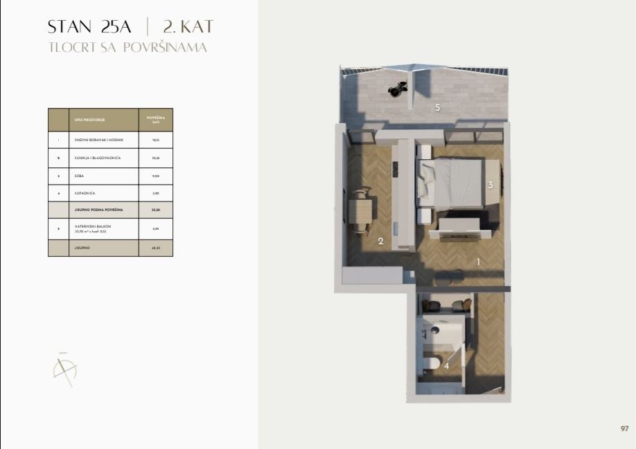 Ukupna obračunska površina stana iznosi 42,35 m².
