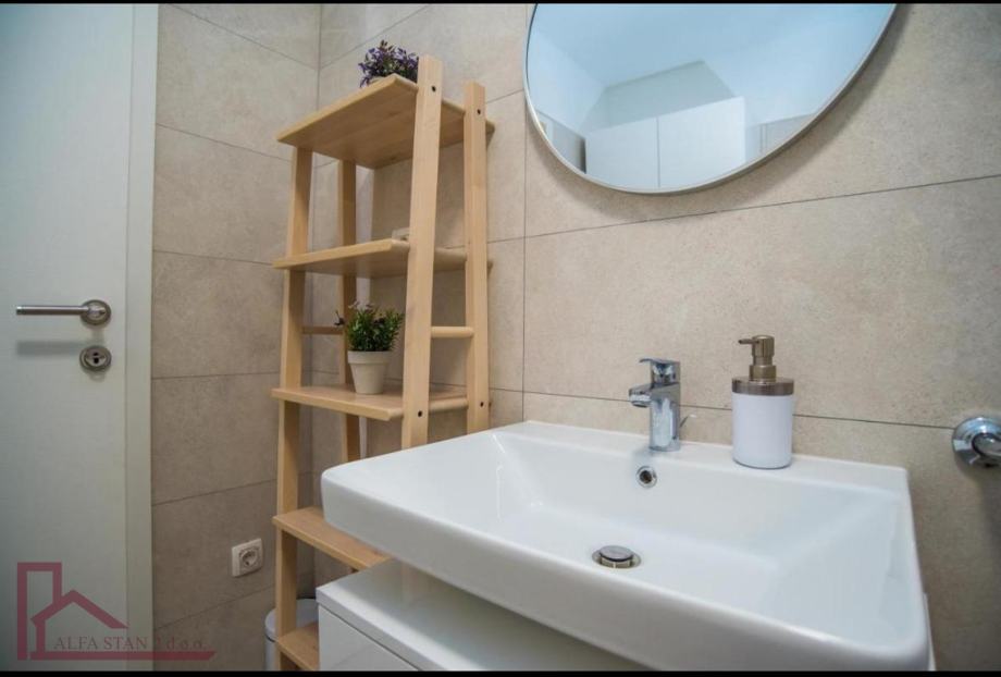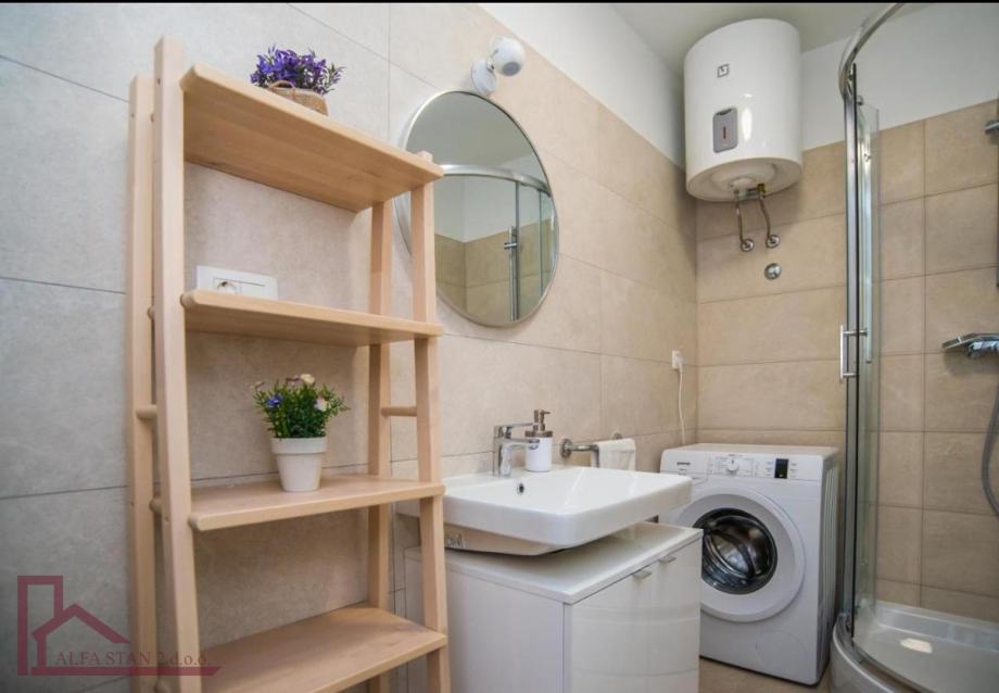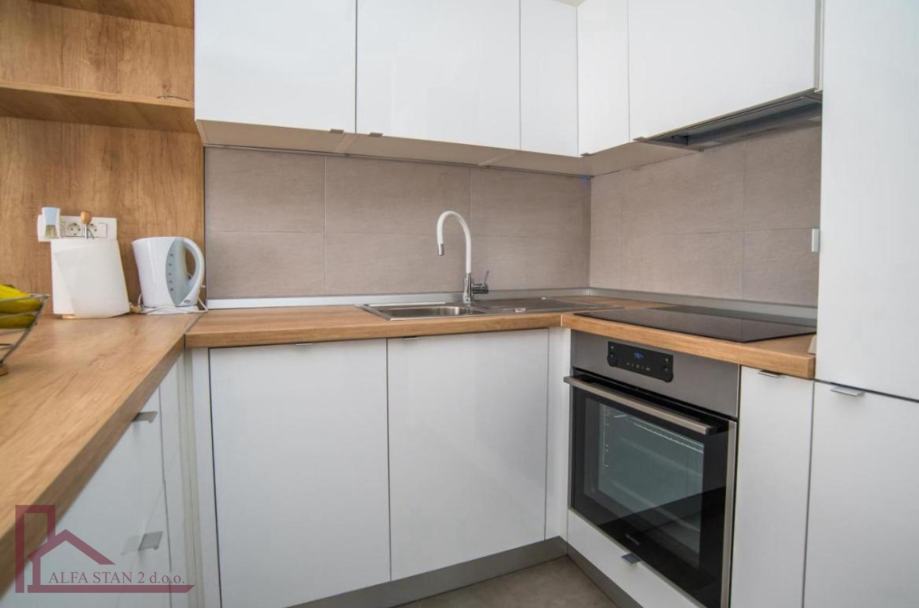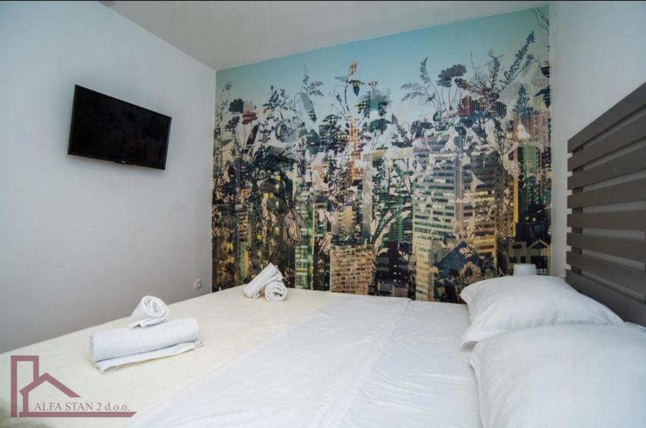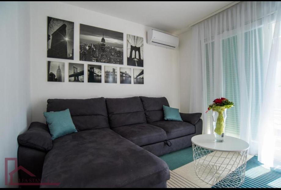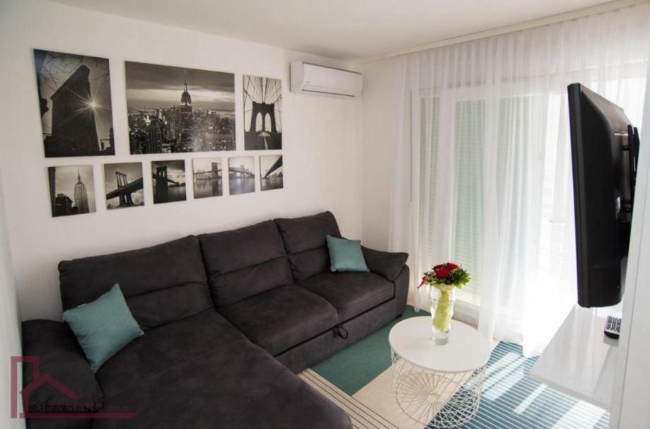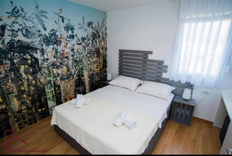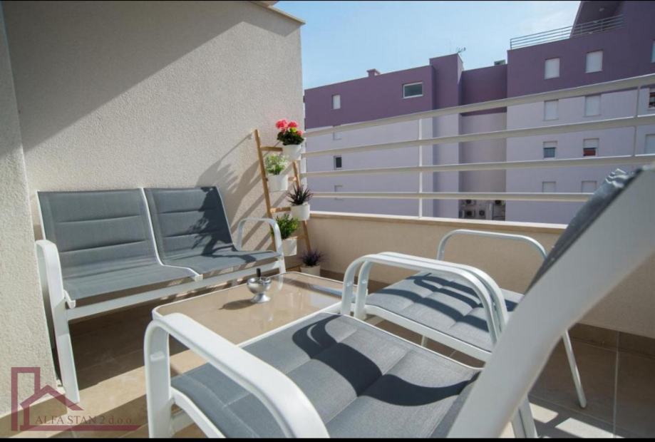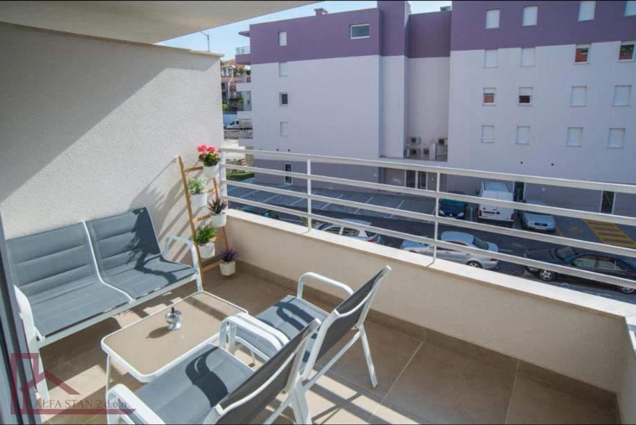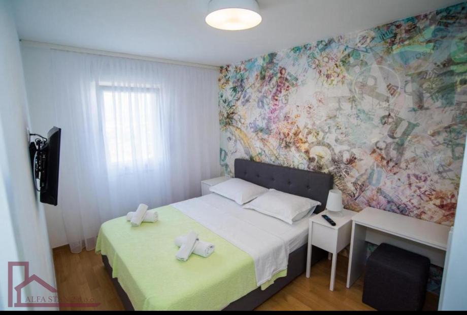 Stan se nalazi na 2. katu. Ima ulazni hodnik, dvije velike spavaće sobe sa bračnim krevetom, kupaonicu, a kuhinja sa dnevnim boravkom i blagovaonom se nalazi u jednom prostoru sa izlazom na veliku lođu. Kompletno je novonamješten i opremljen.
