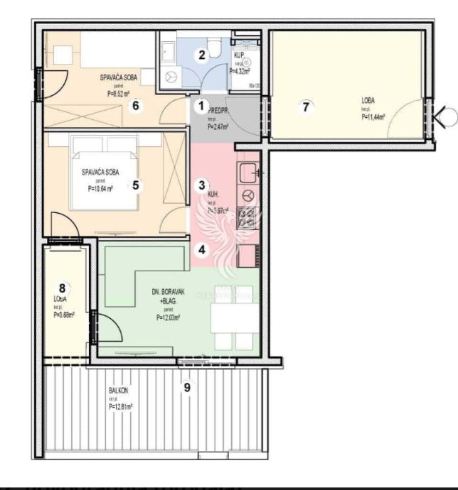 Stan se sastoji od ulaznog prostora, kupaonice, dviju spavaćih soba, kuhinje s blagovaonom i dnevnim boravkom, dviju lođa i balkona.