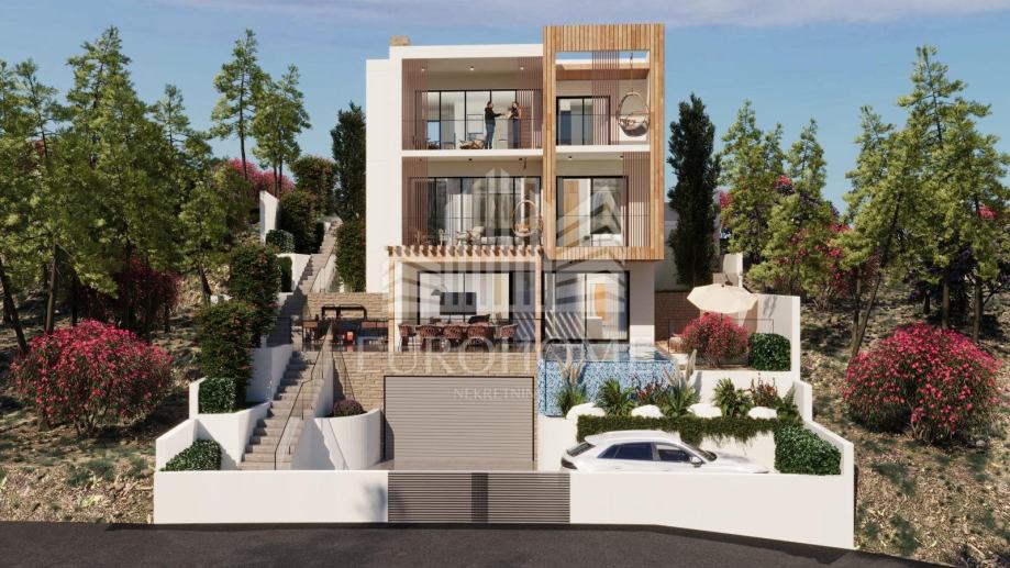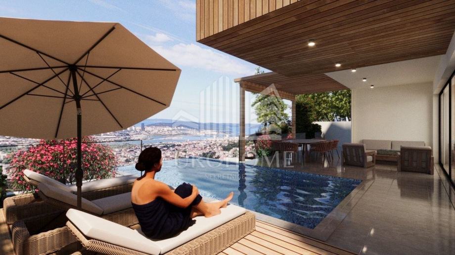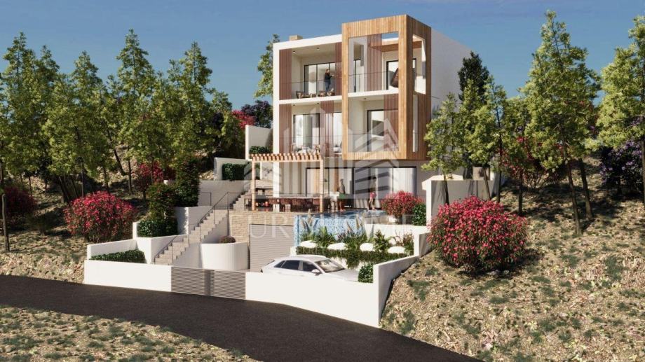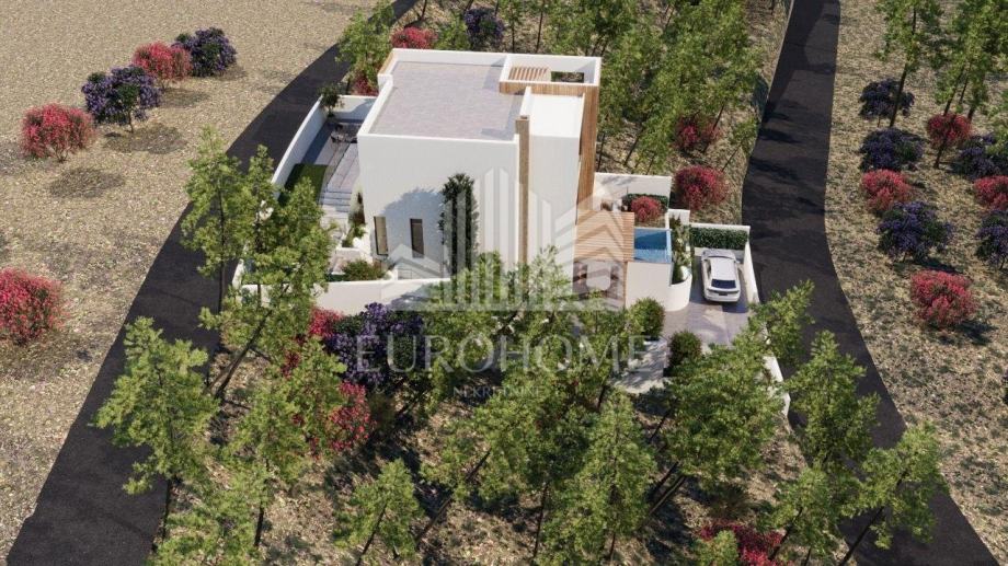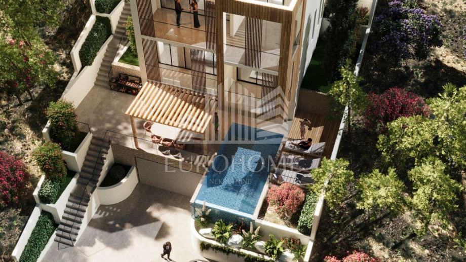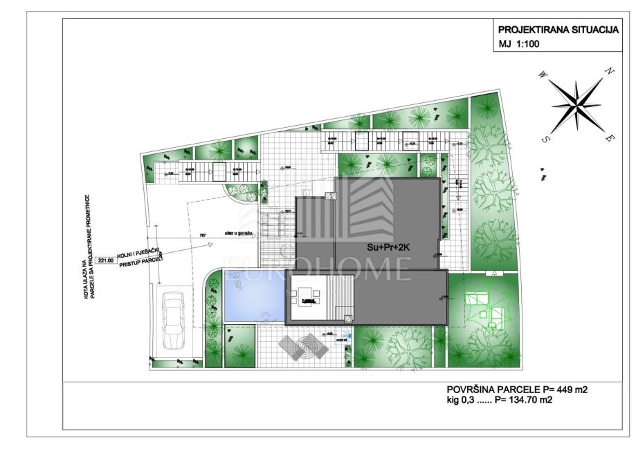 Površina zemljišta iznosi 449 m2. Projektirana vila ima ukupno 353,90 m2 stambene površine, raspoređene na četiri etaže, a uključuje i infinity bazen površine 26,47 m2.