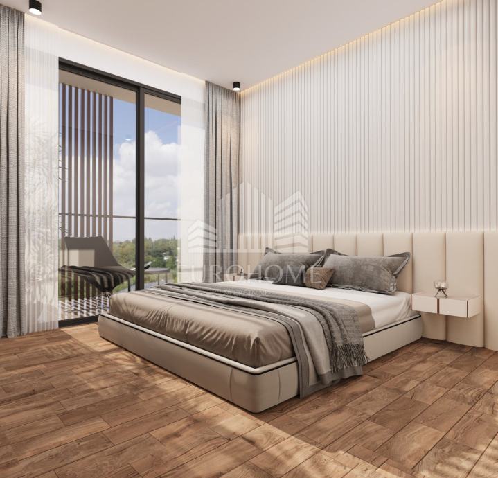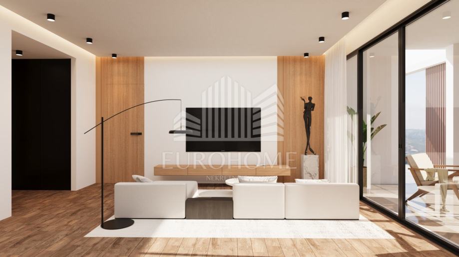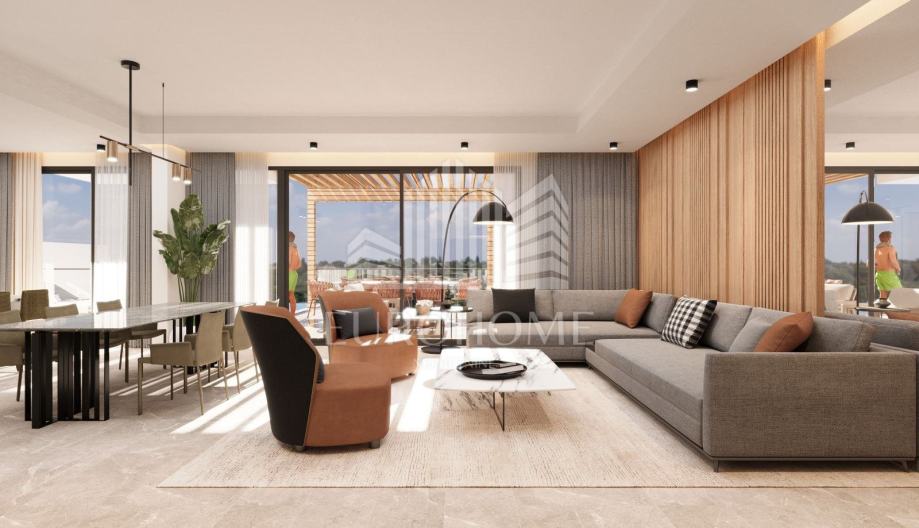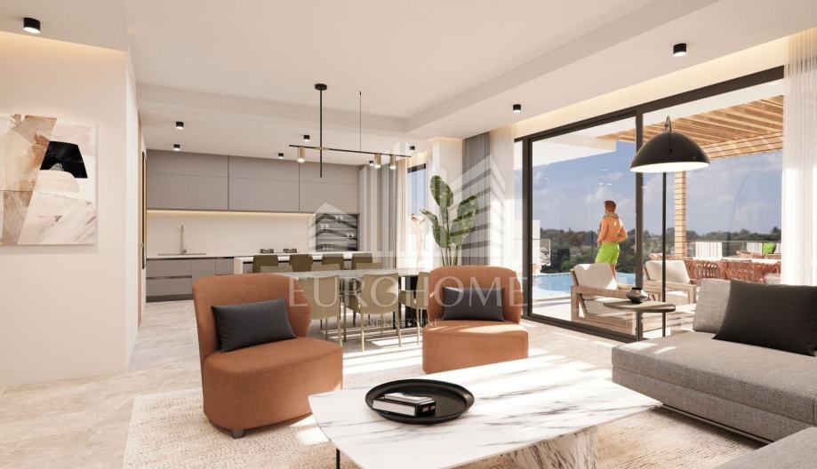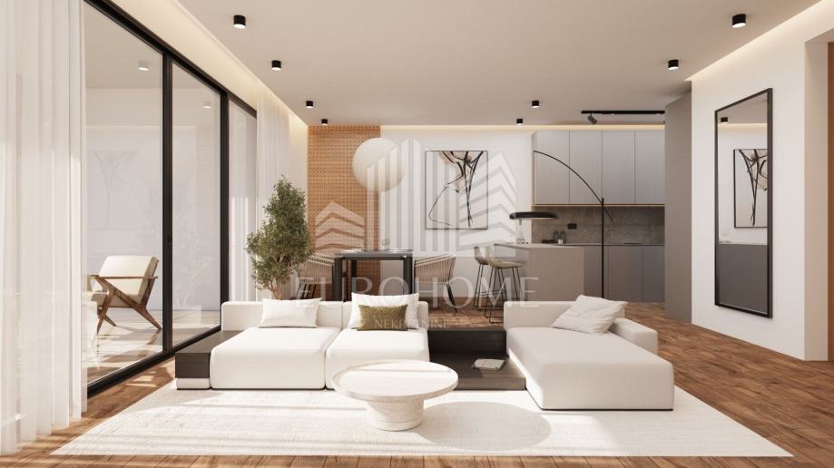 * Prizemlje (135,53 m2): terasa s jugozapadne strane s prostorom za sjedenje, sunčanje, bazen i roštilj; stan 1 uključuje stubište, predprostor, kupaonicu, dnevni boravak, blagovaonicu i kuhinju u konceptu otvorenog prostora te jednu radnu sobu