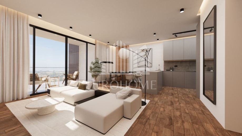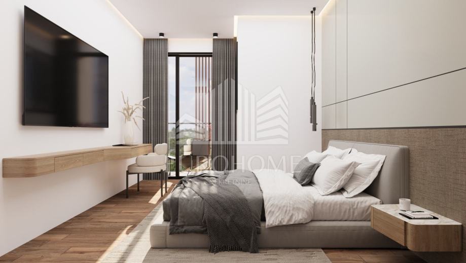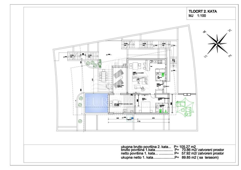 * Drugi kat (104,80 m2): stan 2 uključuje ulazni predprostor, WC, dnevni boravak, blagovaonicu i kuhinju u otvorenom prostoru, jednu spavaću sobu s garderobom i kupaonicom te izlaz na lođu iz dnevnog boravka i sobe