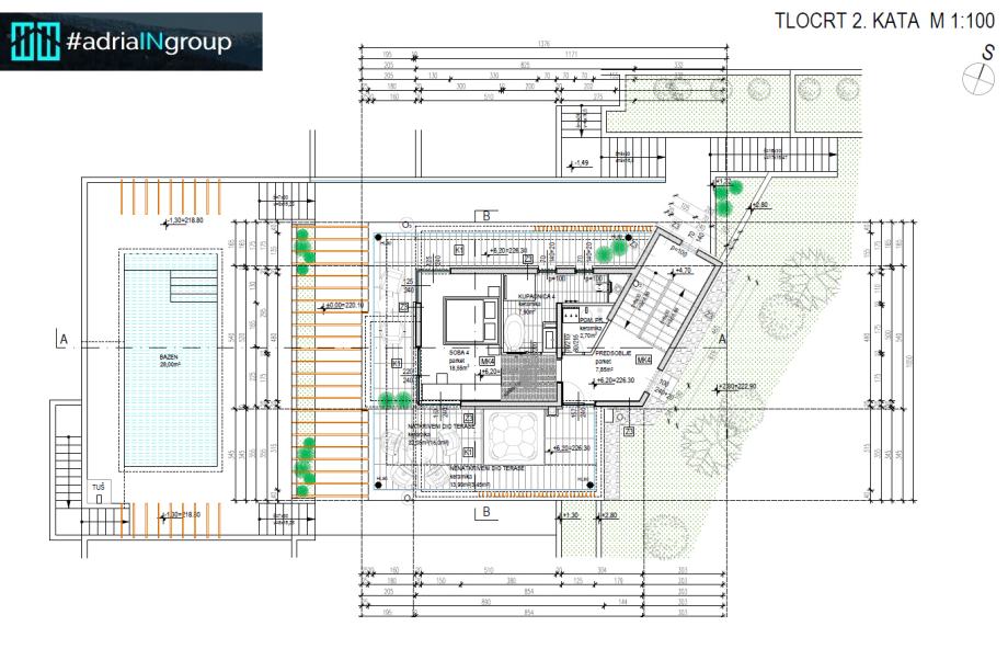 U dvorištu je planiran grijani bazen (32m2), sunčalište, roštilj i parking.