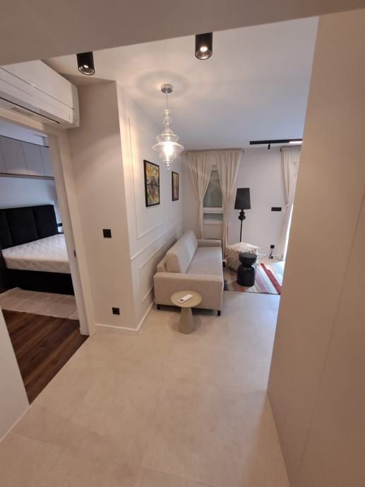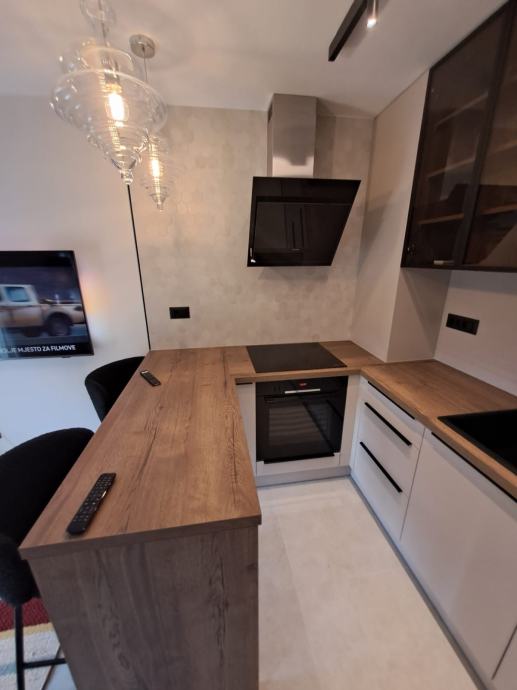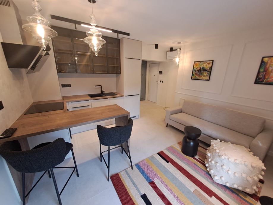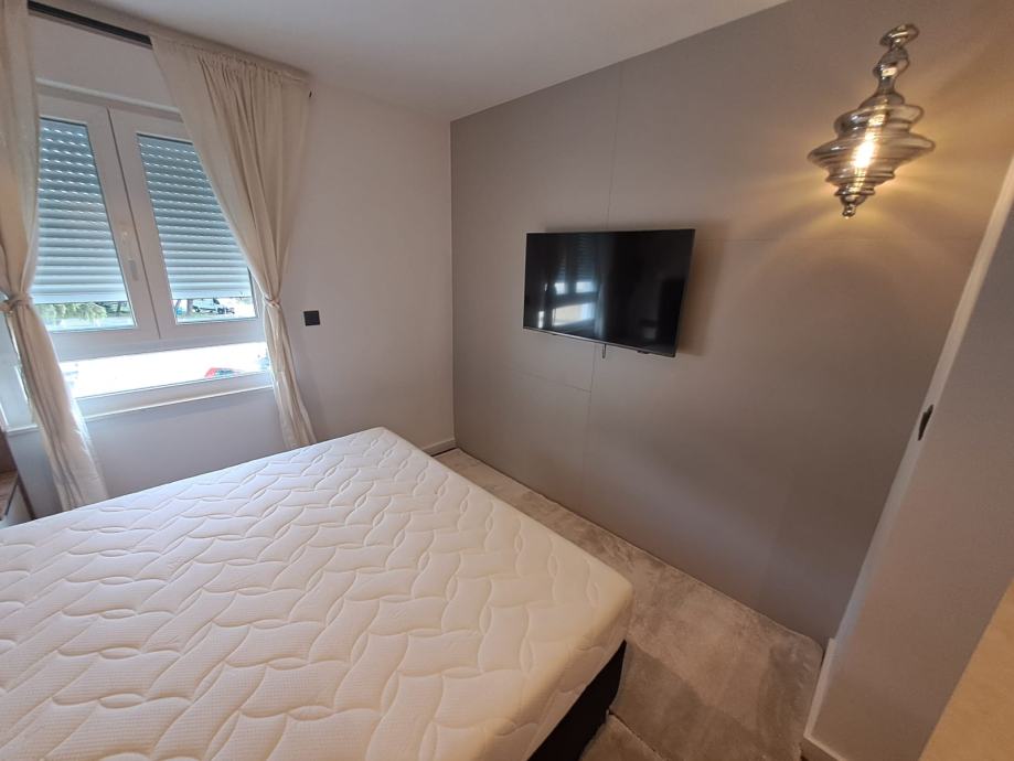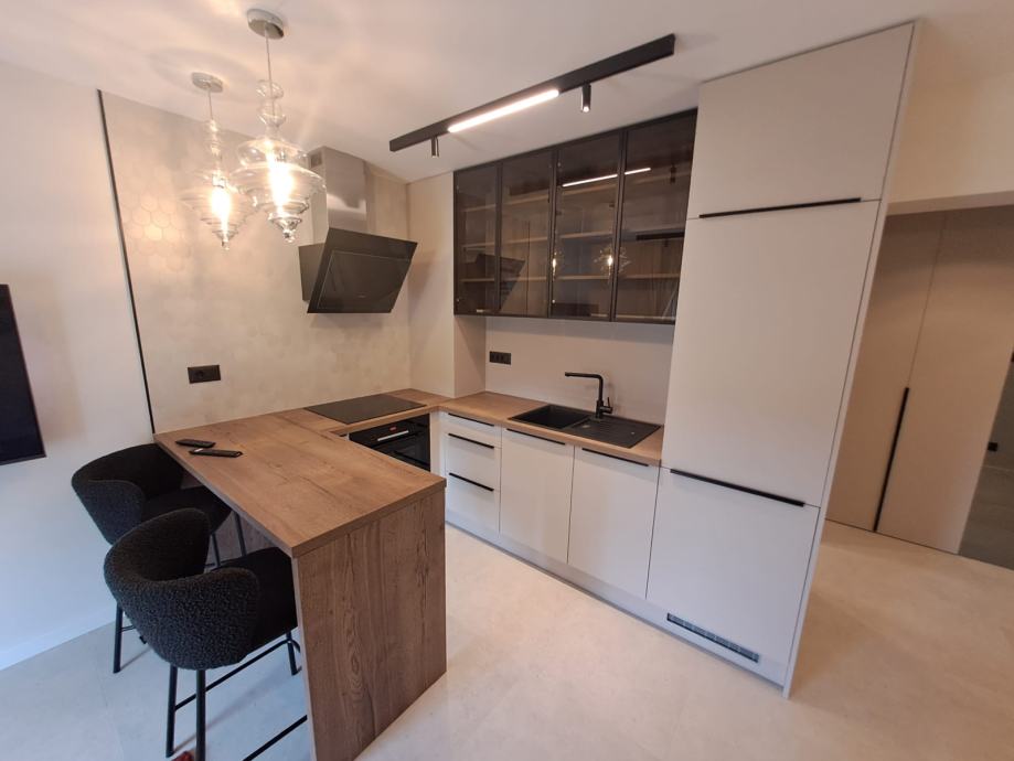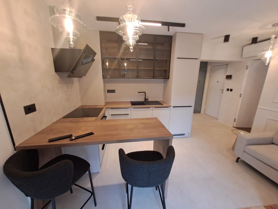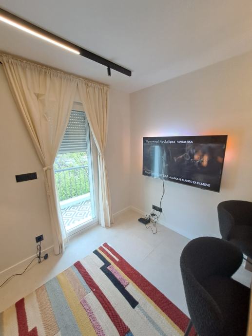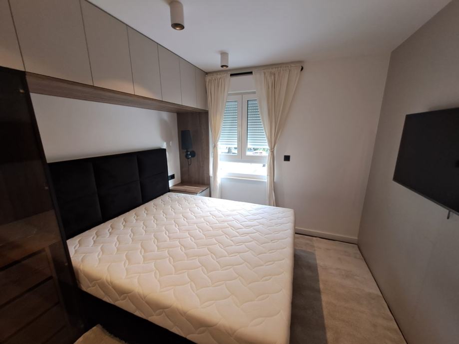 Modern one bedroom apartment situated on second floor in the building. It consist of one bedroom, living room, kitchen with dining room, bathroom and a balcony . The apartment has a modern fully equipped kitchen with dining table, a living room, with smart TV and bathroom with shower.