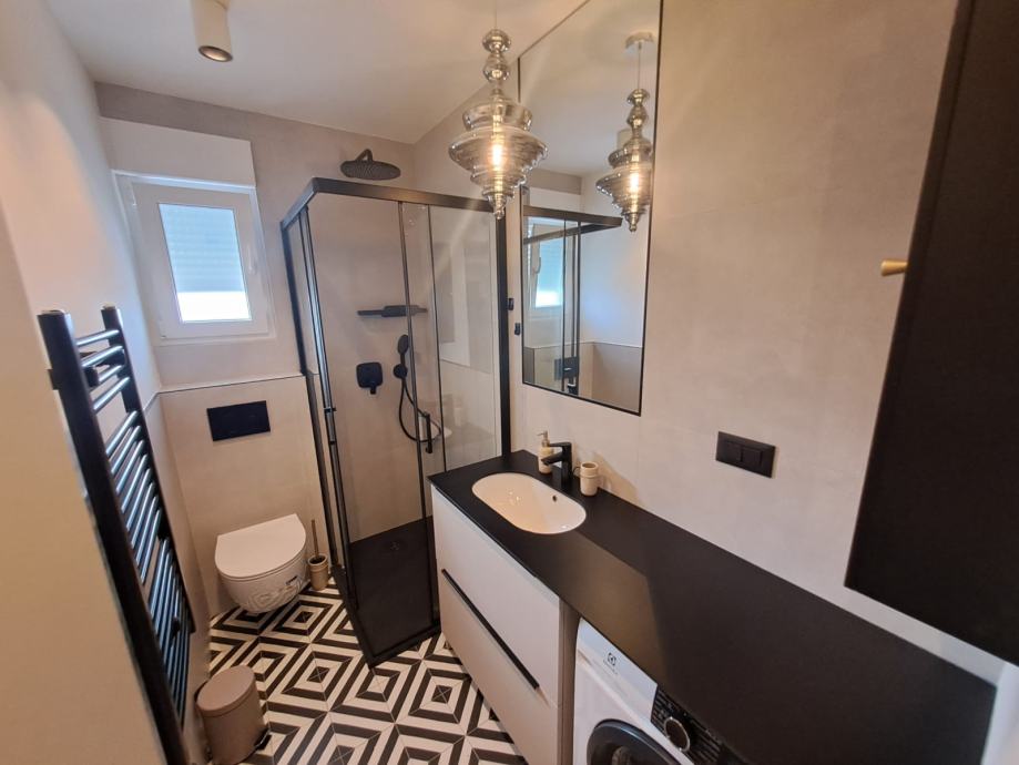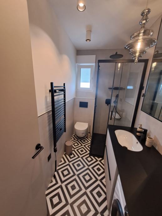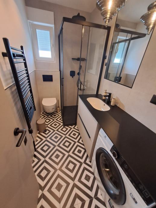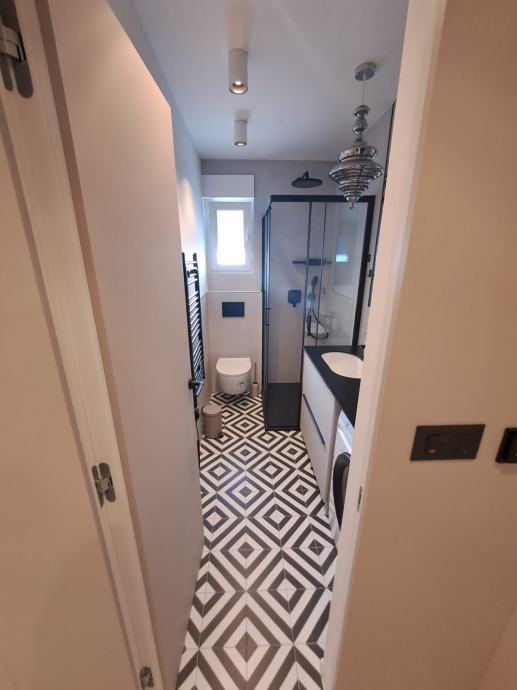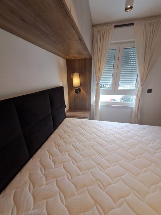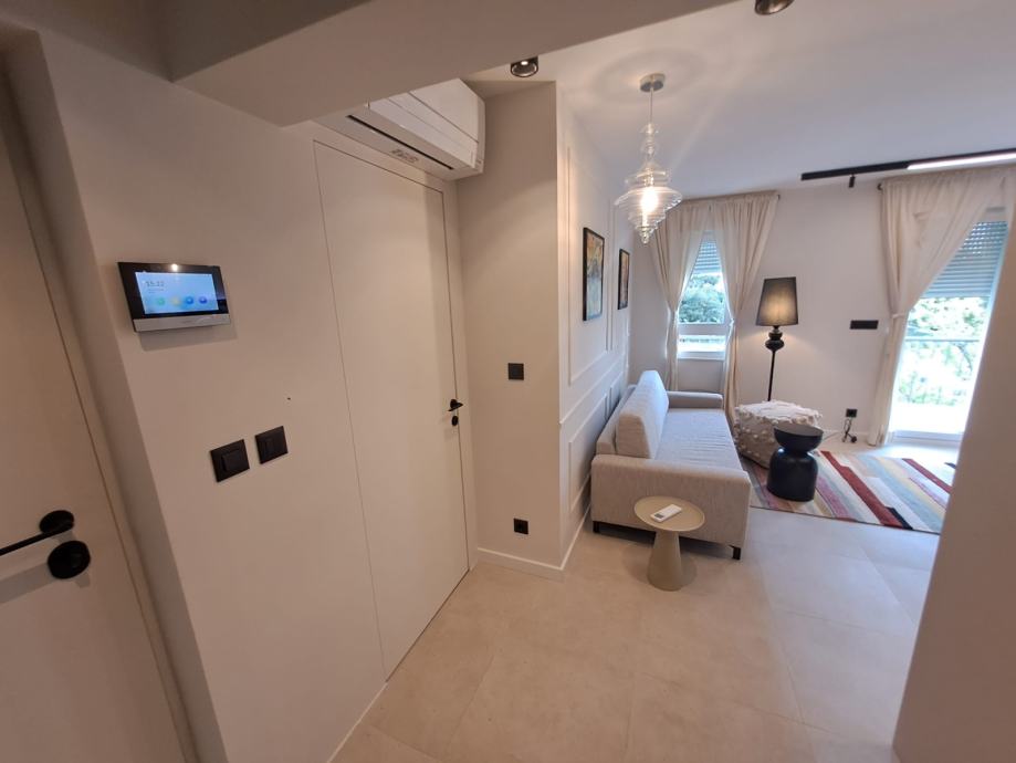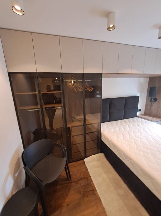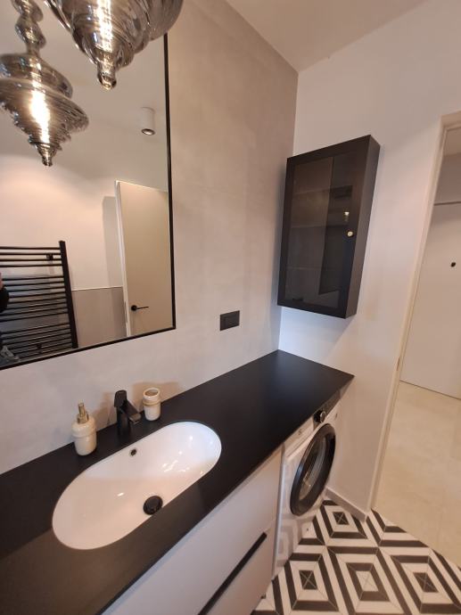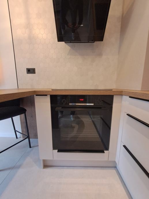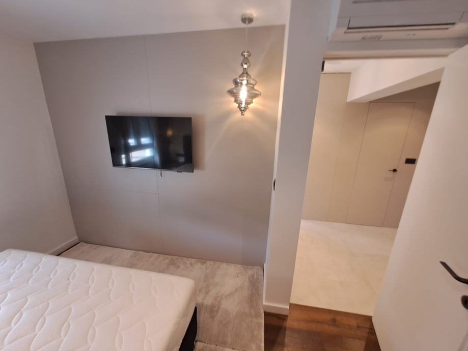 Modern one bedroom apartment situated on second floor in the building. It consist of one bedroom, living room, kitchen with dining room, bathroom and a balcony . The apartment has a modern fully equipped kitchen with dining table, a living room, with smart TV and bathroom with shower.