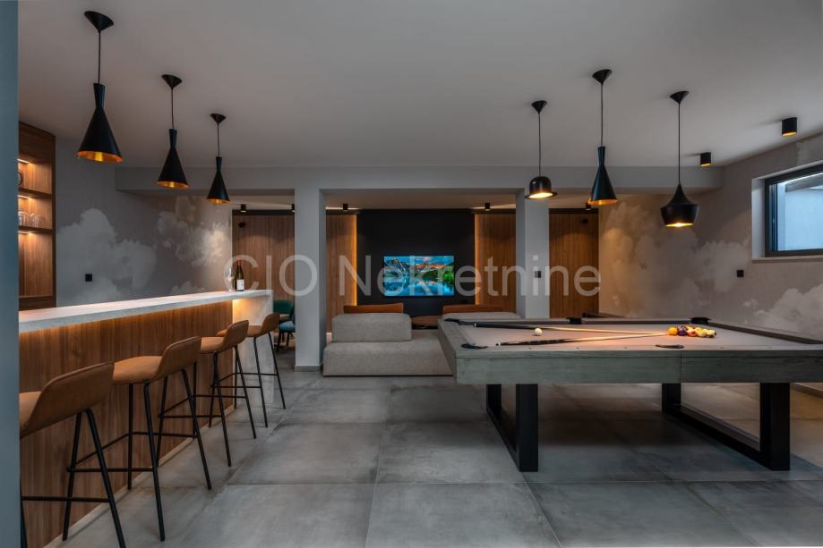 Ispred vile nalazi se prostrana terasa sa preljevnim bazenom dimenzija 8xx4m, kultivirani vrt sa ugrađenim sustavom za navodnjavanje.