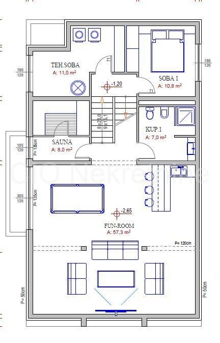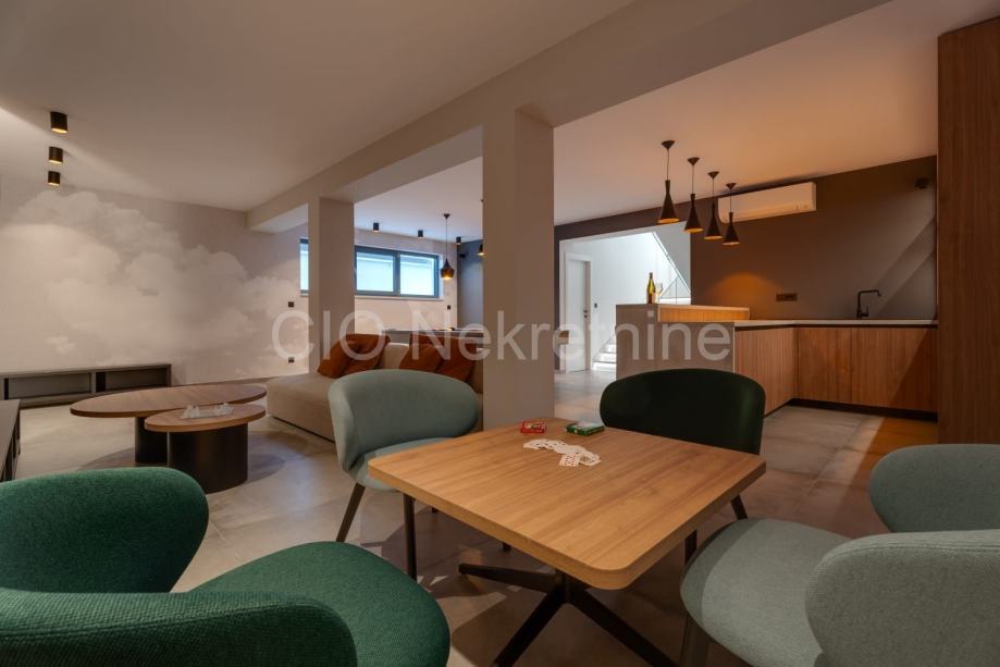 Suteren se sastoji od jedne spavaće sobe, kupaonice, tehničke prostorije praonice rublja i dodatne velike prostorije za zabavu od 57m2 opremljene kuhinjom, kupaonicom i saunom.