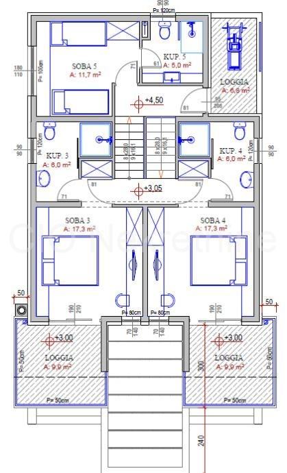 Gornja etaža se sastoji od 3 spavaće sobe svaka sa 3 kupaonice i prostrane lođe s nesmetanim pogledom na more.