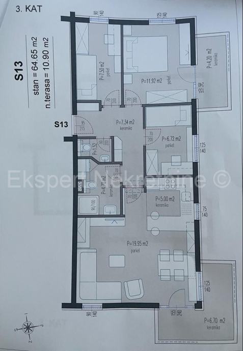 Stambena površina iznosi 64.65m2, stanu pripada balkon površine 10.90m2.Stan ima tri spavaće sobe,kupaonu,wc,predsoblje,dnevni boravak s kuhinjom i blagovaonom.