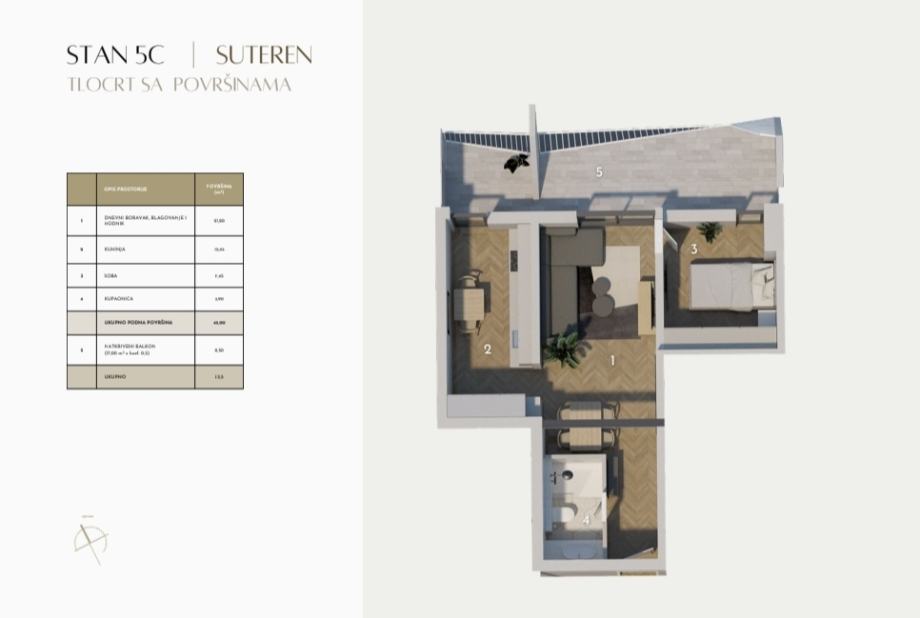 Z1 S5C- Jednosoban stan smješten na u prizemlju, zatvorene površine 45,00 m², kojem dodatnu vrijednost daje natkriveni balkon ukupne površine 17,00 m². Funkcionalan raspored prostora obuhvaća hodnik, jednu spavaću sobu, jedna kupaonicu te dnevni boravak s blagovaonicom i kuhinjom otvorenog tlocrta s izlazom na balkon.