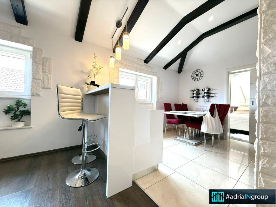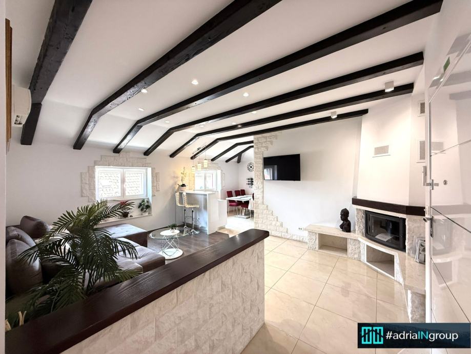 Stan je kvalitetno renoviran i u potpunosti opremljen, spreman za useljenje bez dodatnih ulaganja. Odlikuje ga kombinacija tradicionalne dalmatinske arhitekture i modernog dizajna.
