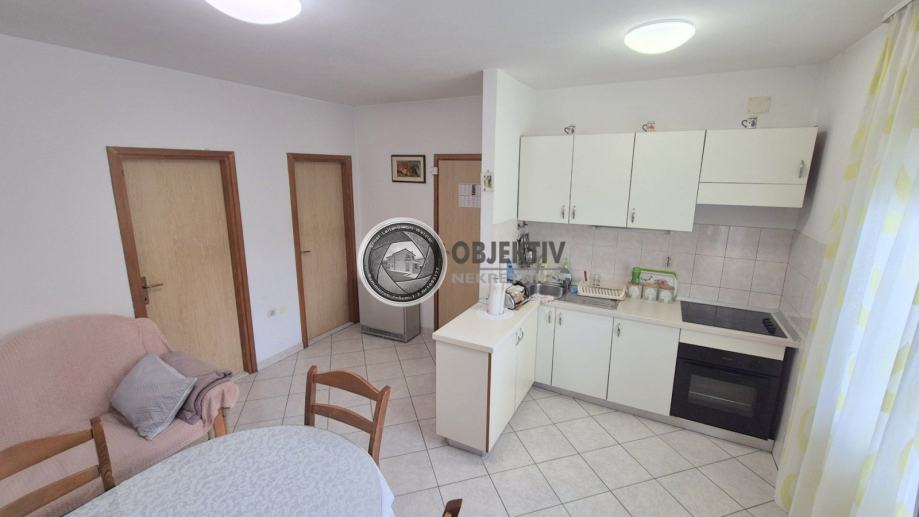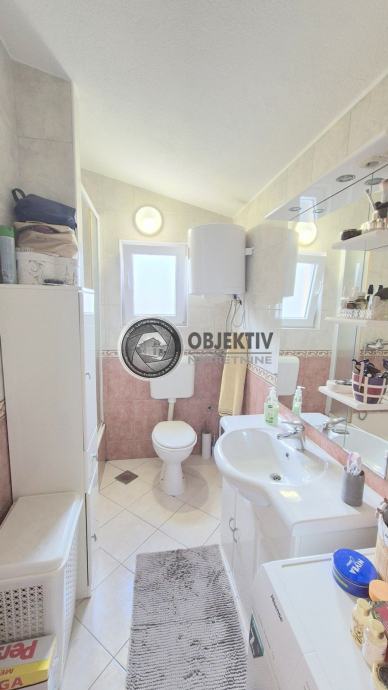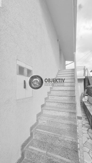 U PRIZEMLJU je stan površine 55 m2 koji se sastoji od kuhinje s blagovaonicom i dnevnim dijelom, dvije spavaće sobe (jedna se trenutno koristi kao dnevni boravak), kupaonice te ulaznog dijela (hodnika).