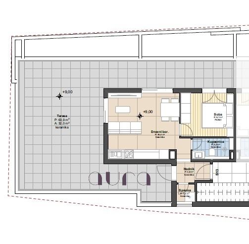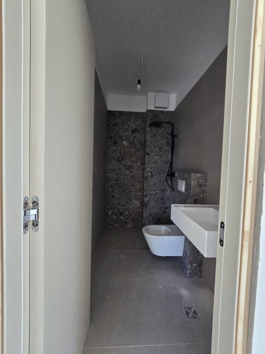 The apartment is located on the superstructure of the building and consists of a hallway, storage room, bathroom, open space of the living room connected to the kitchen and dining room, bedroom and partially covered terraces. From the living room and the bedroom there is an exit to terrace. The closed area of the apartment is 35.60 m2, while the open part consists partially of covered terrace of 63.91m2. The total gross area of the is 99.51m2 and the calculation area of the apartment is 51.55m2 (see floor plan).
