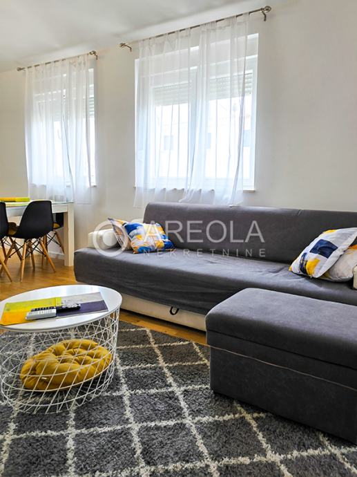 Stan obuhvaća 50 m² pažljivo uređenog prostora, uključujući open space dnevni boravak s kuhinjom i blagovaonicom, dvije spavaće sobe, kupaonicu i loggiu od 3 m².